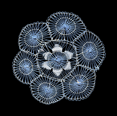 colored fine thread, rayed center, 11 'leaf' petals outside - ~7.25" diameter (Missionary_5h)