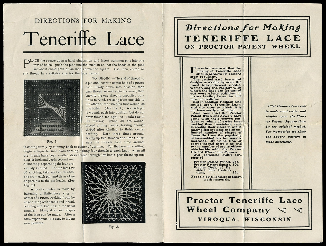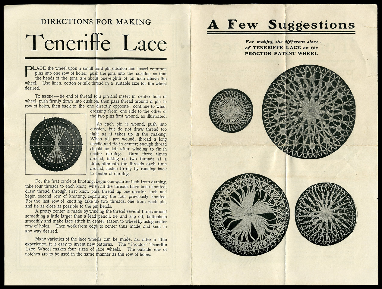 Proctor Teneriffe Lace Wheel InstructionsThese instruction sheets were included in the packaging for the wheels, and are separate from the Proctor Teneriffe Lace book. They are the front and back of one piece of paper, folded in four to fit in the box. |