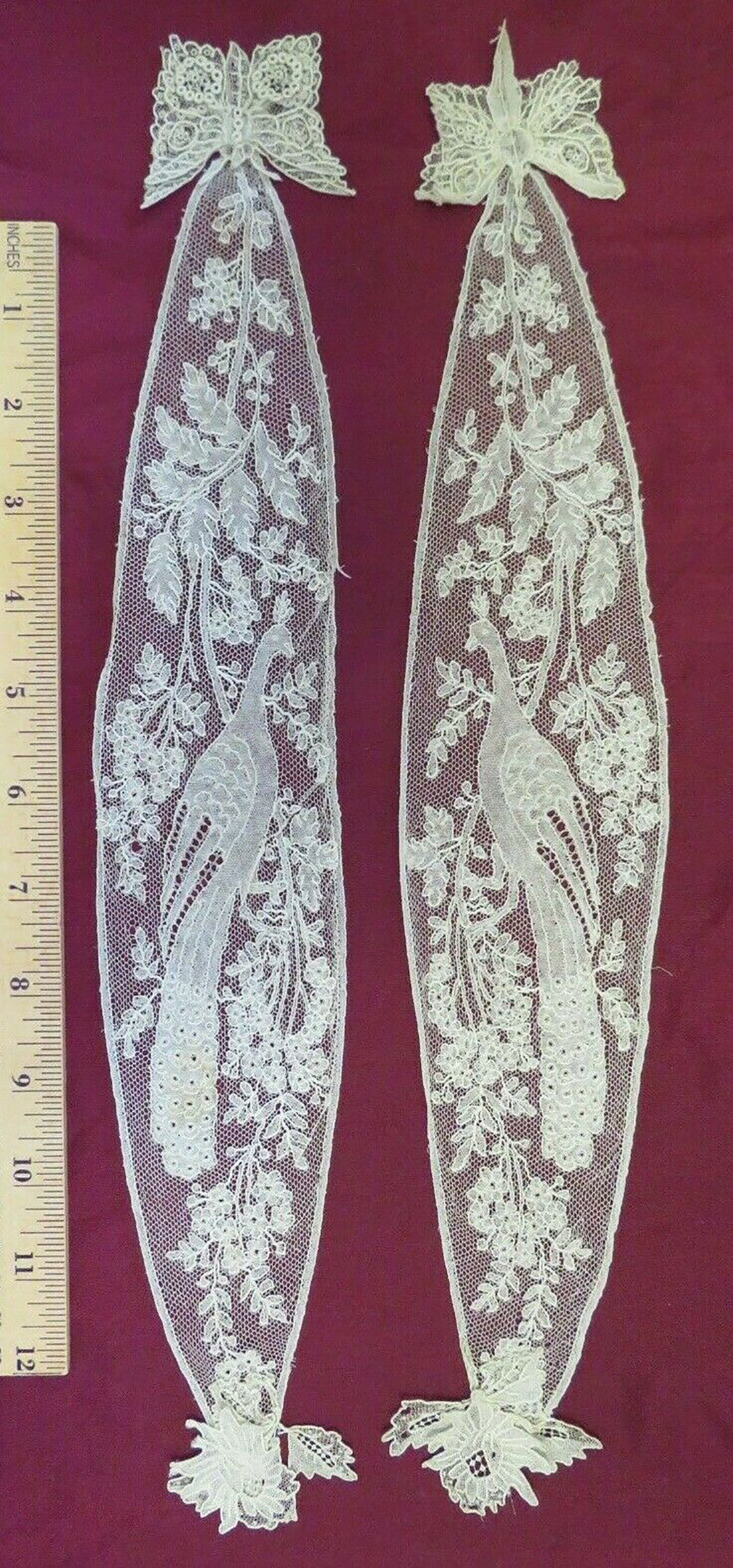 These are probably stocking inserts which have been removed from the original socks - there is the occasional fluffy cotton thread along the border. Black Chantilly sock inserts come up occasionally in the same long oval form, but a white Chantilly pair is very rare. The Point de Gaze butterflies and flowers at the ends appear to be a much later addition - they are attached with a running stitch with coarse thread. These needlelace elements are more commonly associated with samples given out by lace shops in the mid 20th century - the main pieces are earlier. The halfstitch used in all solid elements is indicative of Belgian Chantilly, as is the cotton thread. There is an unusual knotted thread along the outsides of the tops of both pieces - these might be a means of adding threads as the pieces widen.