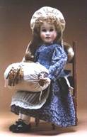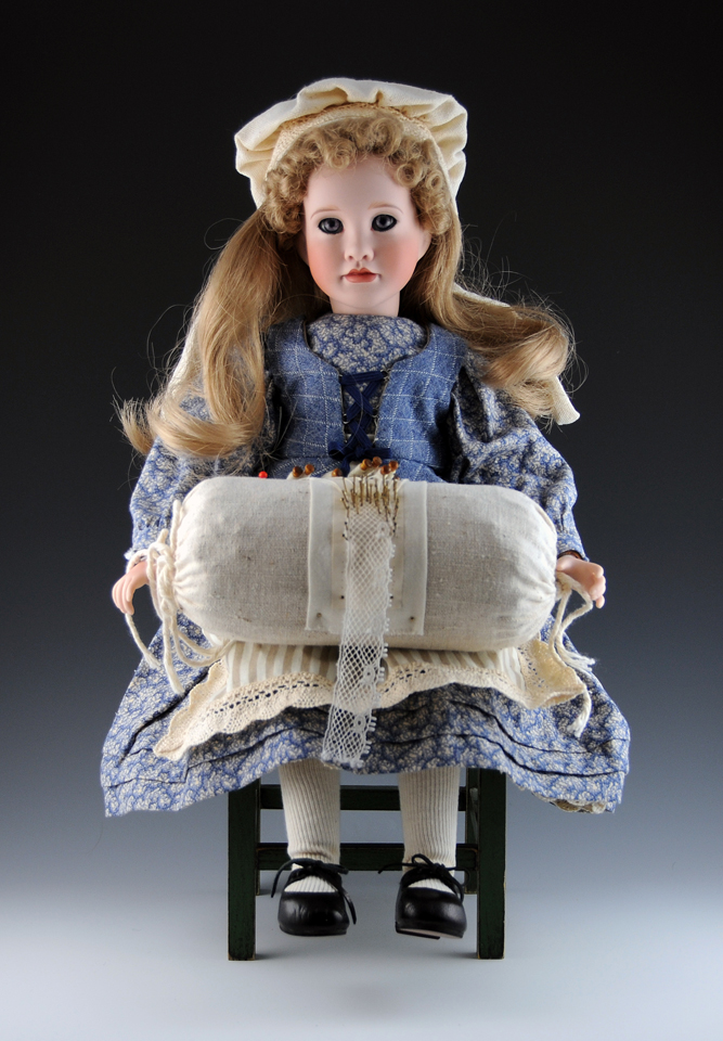 Wendy Lawton - Bobbin Lace Wendy Lawton made her first doll in 1978. She and her husband Keith opened The Lawton Doll Company in Turlock, California in 1983. They have produced more than 250 limited edition dolls. Lawton has won the DOTY (Doll of the Year sponsored by the magazine Doll Reader) eleven times, and the Dolls of Excellence Award (sponsored by Dolls Magazine, Jones Publishing) three times. I asked Wendy how she came about the idea for this doll, and here’s an answer that should please Jules Kliot: This doll is part of the Wendy Lawton “Fabric of America” collection. The other doll in the series is “Zudie’s Coverlet – 1996. My example was purchased directly through the Wendy Lawton company in 2007. It was apparently the last one they had in stock, but did not have the correct chair. I bought a poor substitute on Ebay, it’s a bit too high and her feet are off the floor. I’m still looking for the right chair. The Lawton advertisement shows the pillow with the bobbins on the wrong side – I’ve corrected this in the display. The pillow has elastic loops on the ends that go over her hands to secure the pillow in place, which cannot be seen in the photo. The doll is very beautifully made, 16” high, porcelain head and hands with a jointed wooden frame and a human hair wig. The ‘lace’ on the pillow is machine-made, and the bobbins are secured with small brass pins. first posted 1/19/2009 |