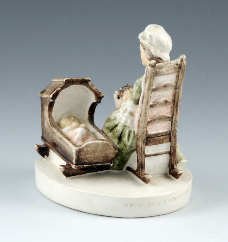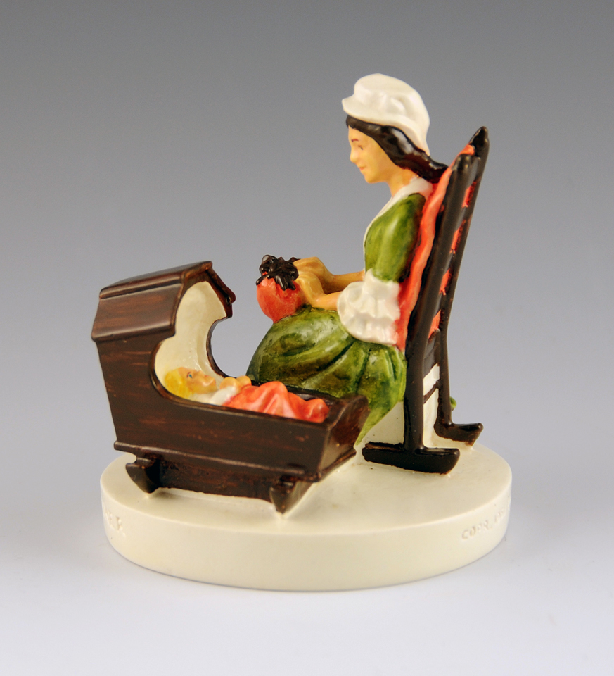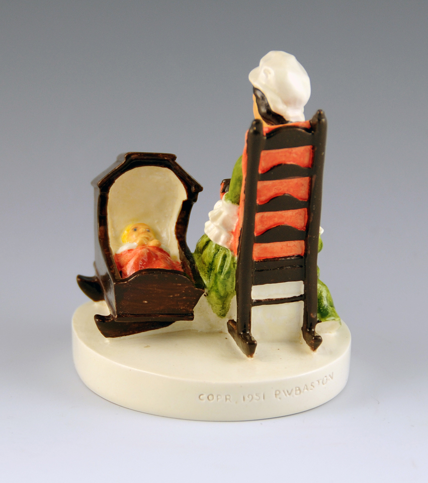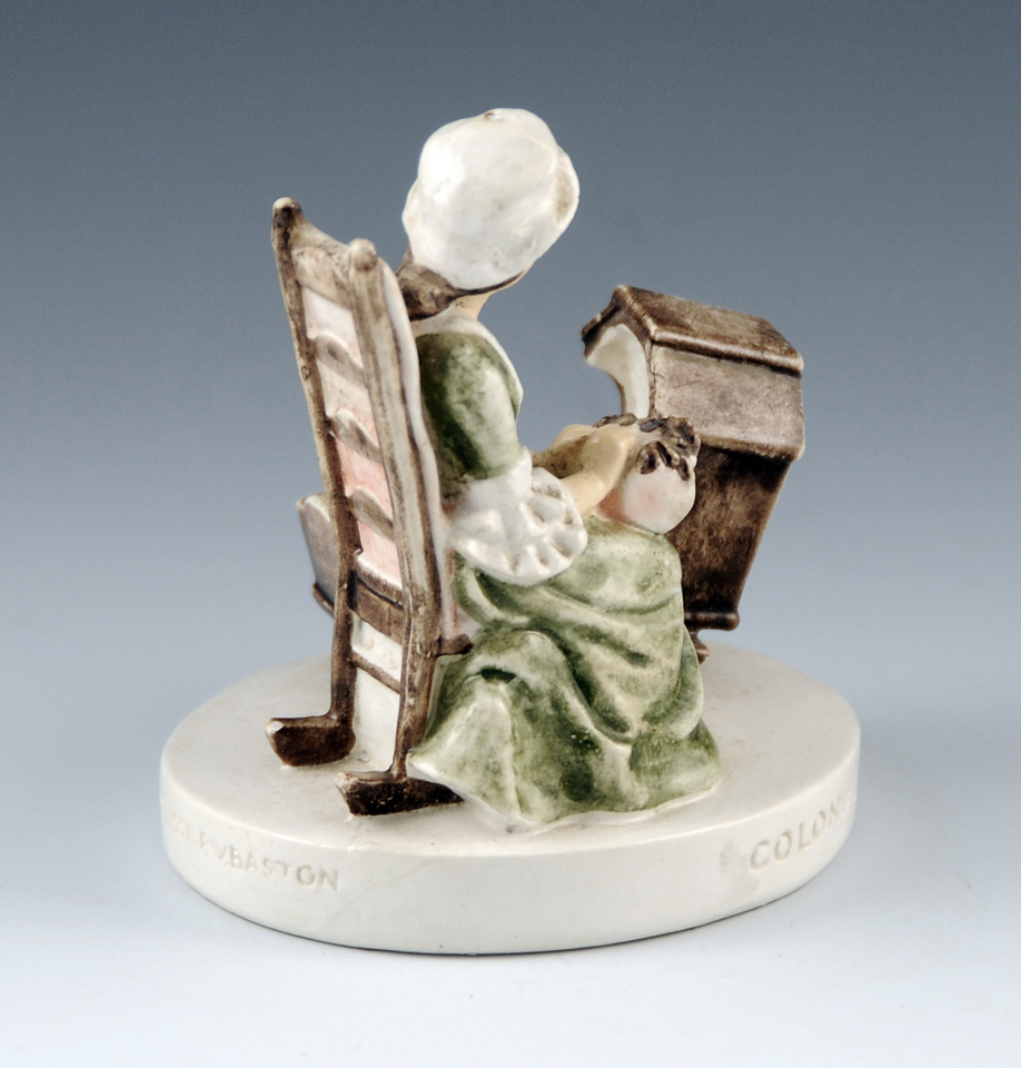 The design of the figure was conceived by Prescott W. Baston as a ‘mother and child’ concept. He visited the Ipswich Historical Society to research the costume and cradle. The actual pillow and bobbins appear to be fairly accurate depictions of Ipswich lacemaking equipment. This example is either SML-173 (first issued 1951/withdrawn 1975) or SML -173C (first issued 1976). It might be the 'C' version if you think about the pencil mark on the base. This second piece is more recent, and is actually quite nice. It has a much darker green dress than the original and Pepto-Bismol pink highlights. It came with the original box, labeled #6301 Colonial Lace A SEBASTIAN MINIATURE I’m not in a position to figure out the ins and outs of all the later editions of this figure, and why the design attribution suddenly has gone to the original Baston’s son. first posted 1/19/2009 |