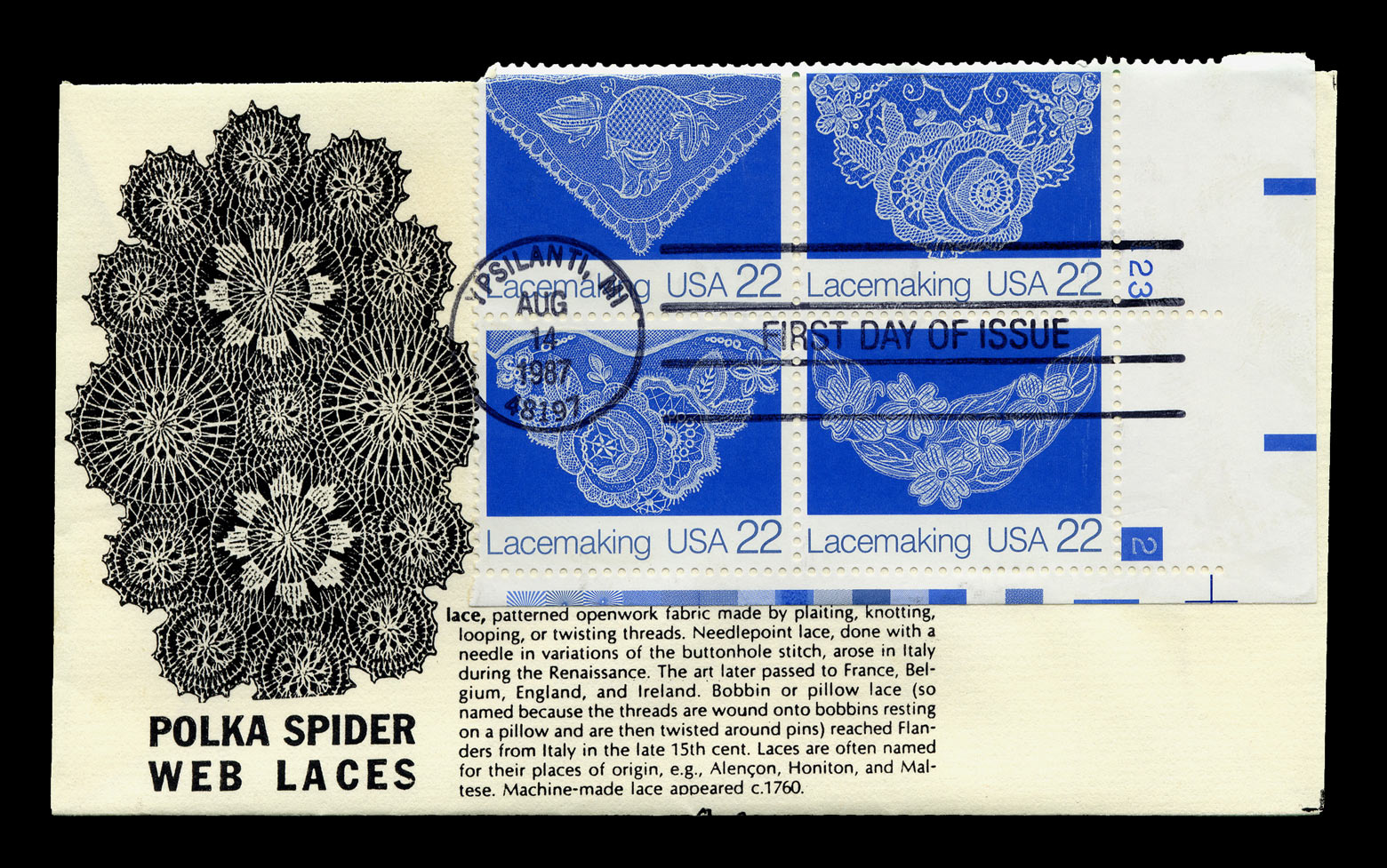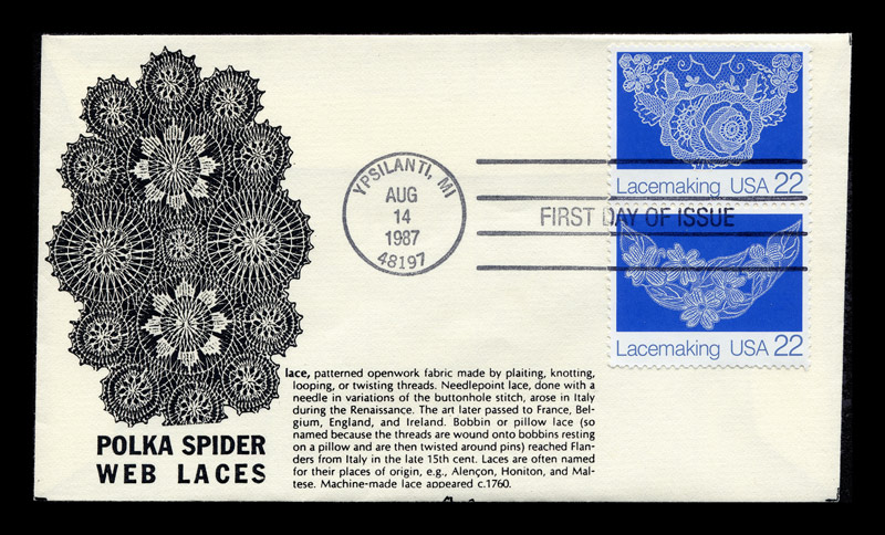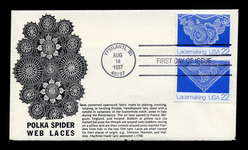 Maker "P" Complete set on 3 unaddressed nonstandard #6-3/4 (6-5/16" x 3-5/8") cream colored envelopes. “First Day of Issue” cancellations and postmarks. One envelope has a Plate Block of 4 with the plate number, the two others have two stamps each. All have the same backs, so I only illustrate one. The cachets honor ‘Polka Spider Web Laces’, with Polka Spider doilies depicted on the backs of all envelopes. Polka Spider lace was a derivative of Teneriffe needleweaving, with designs issued by K. and K. Products of Chicago in 1939 and 1941. I am unable to find any reference to the “Handcrafted by P” issuer of this cachet. The work on these cachets seems fairly crude and the doilies are off-center. The text is unrelated to Polka Spider lace.