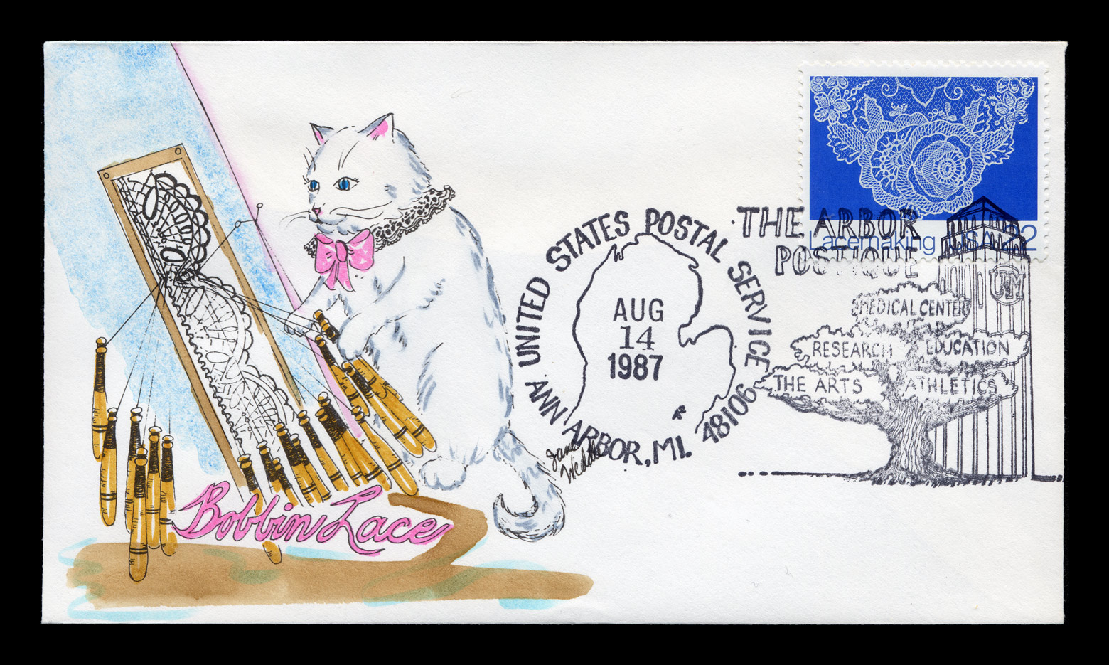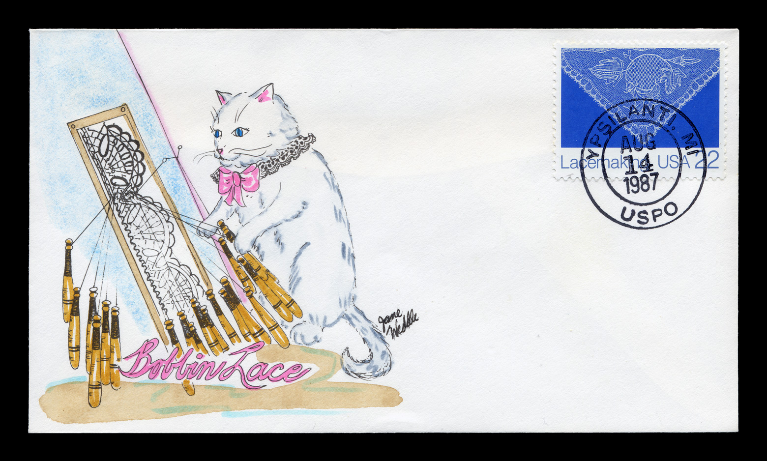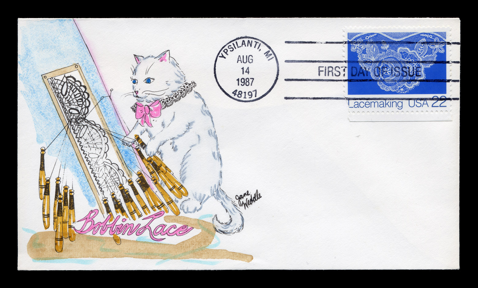 Jane Weddle Single #6-3/4 (6-1/2" x 3-11/16") unaddressed envelope with block of 4 stamps. “First Day of Issue” cancellation and postmark. Cachet design of a cat playing with lace bobbins (how well we know…). Jane Weddle is well known for including cats and kittens in her hand-painted watercolor cachets. Dedicated to my succession of most excellent cats; Pussy Willow, Umber-ella Porcelana, Neutrino/Jasmine, and Nike. first posted 1/15/2009 |
