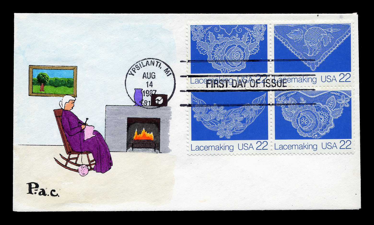 P. A. C. Single #6-3/4 (6-9/16" x 3-11/16") unaddressed envelope with block of 4 stamps. “First Day of Issue” cancellation and postmark. The hand painted cachet is of a woman knitting, sitting in a rocking chair. It is #6 of 20 produced. I don't know anything about the artist. first posted 1/15/2009 |