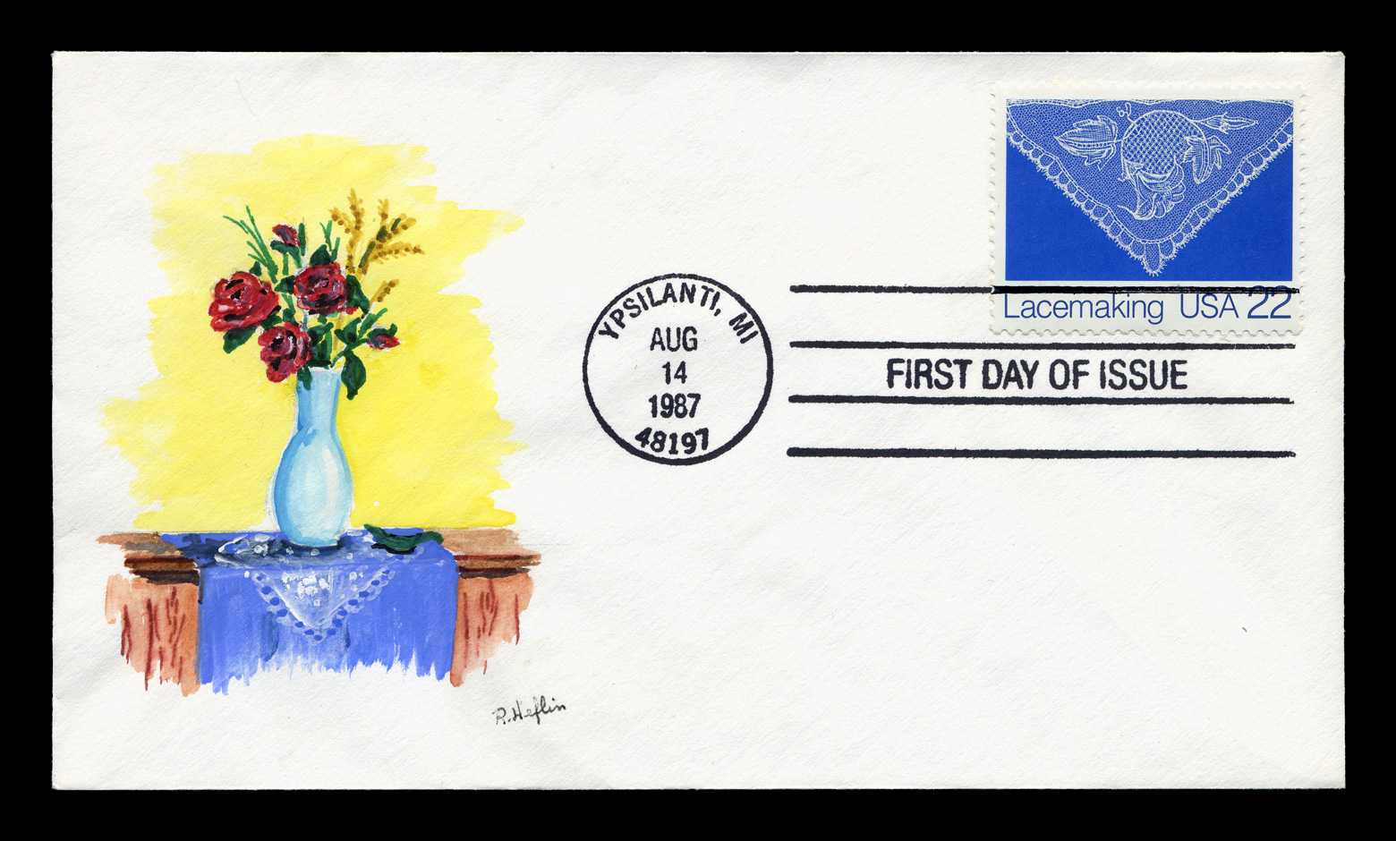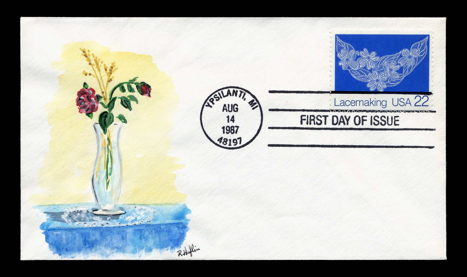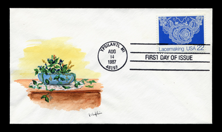 R. Heflin Four #6-3/4 (6-1/2" X 3-11/16") unaddressed envelopes with single stamps. “First Day of Issue” cancellations and postmarks on each. Beautiful hand-painted watercolors of a different plant or vase of flowers on each, by R. Heflin. Heflin often includes plants or nature scenes on cachets. first posted 1/15/2009 |