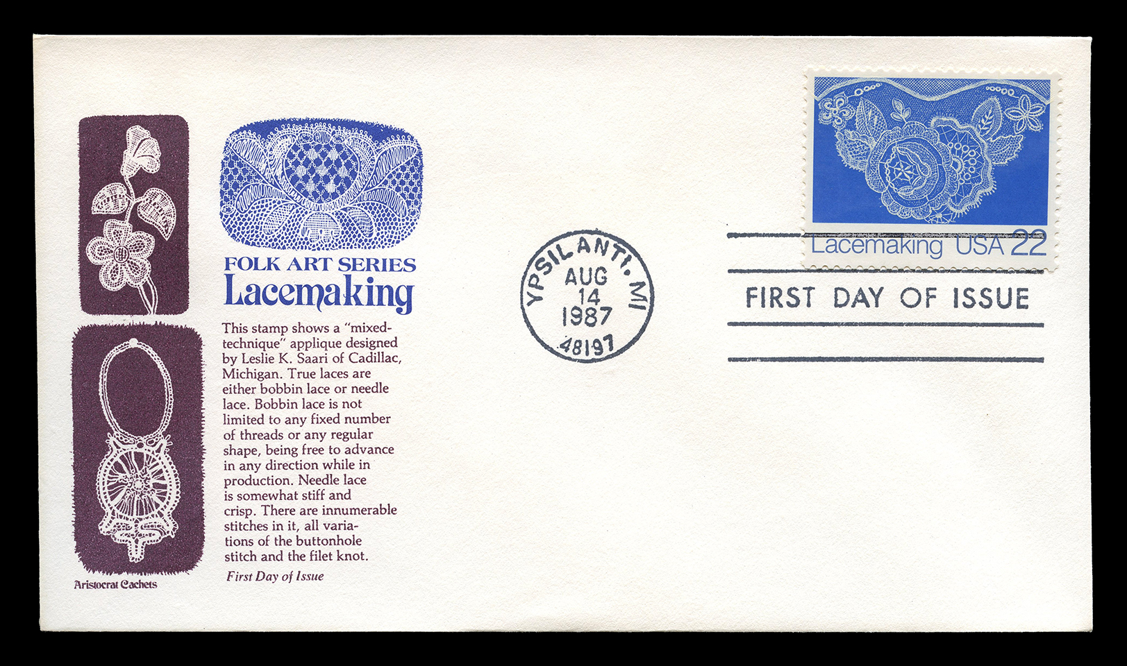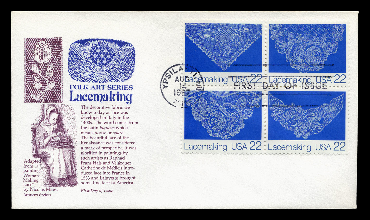 Aristocrat Cachets Single #6-3/4 (6-1/2" x 3-5/8") unaddressed envelope with block of 4 stamps. “First Day of Issue” cancellation and postmark. The cachet combines images of lace, explanation, and part of a Nicolas Maes painting. There are 4 more envelopes with slightly different cachets, each with only one stamp, unfortunately not in my collection. I found an old address for Aristocrat Cachets: Michael K Drummond, PO Box 450, Seaford, De. 19973, but no other information. first posted 1/10/2009 |