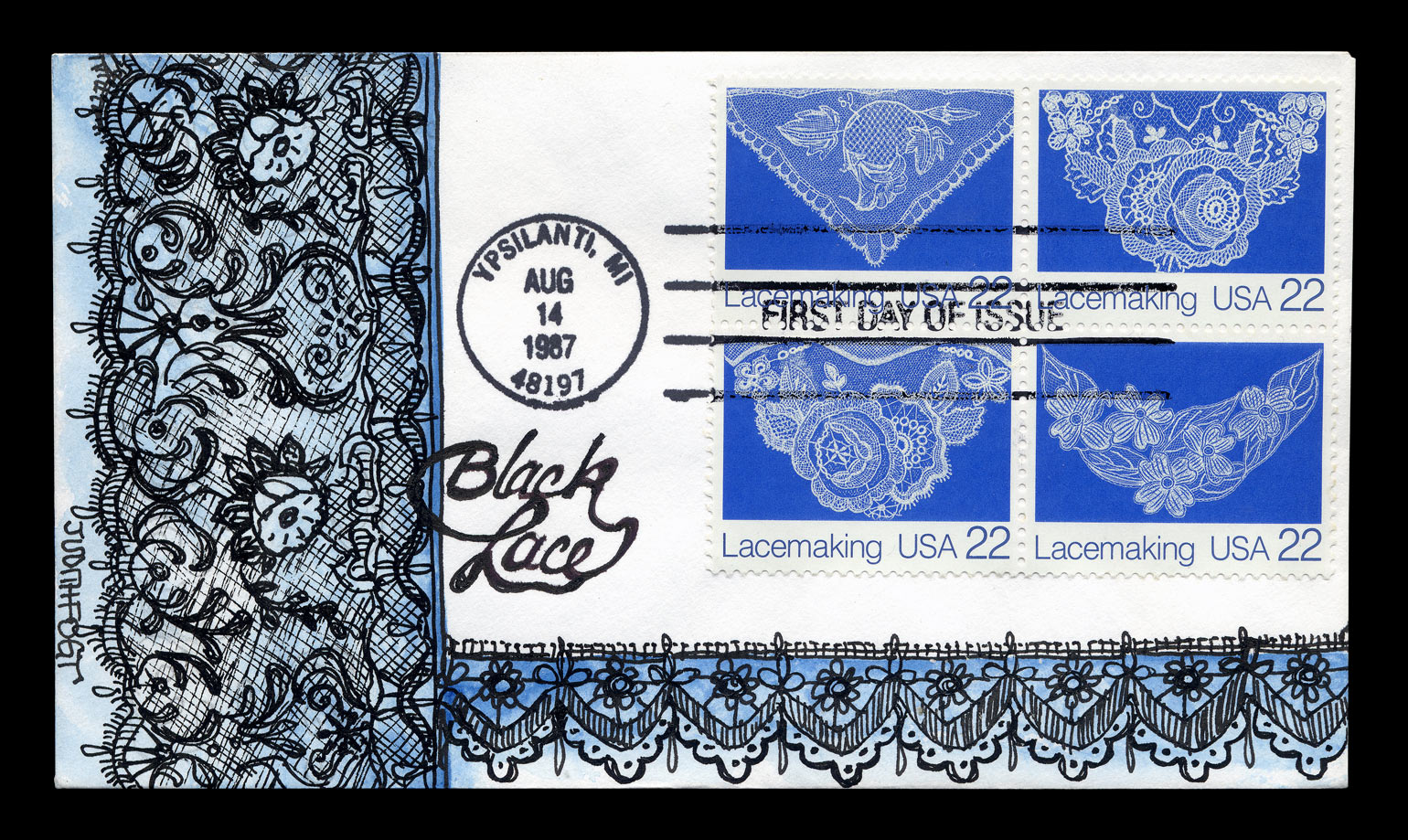 #6-3/4 (6-1/2" X 3-5/8") unaddressed envelopes with four stamps. “First Day of Issue” cancellations and postmark. Beautiful hand-painted watercolors of a black lace on a blue background.