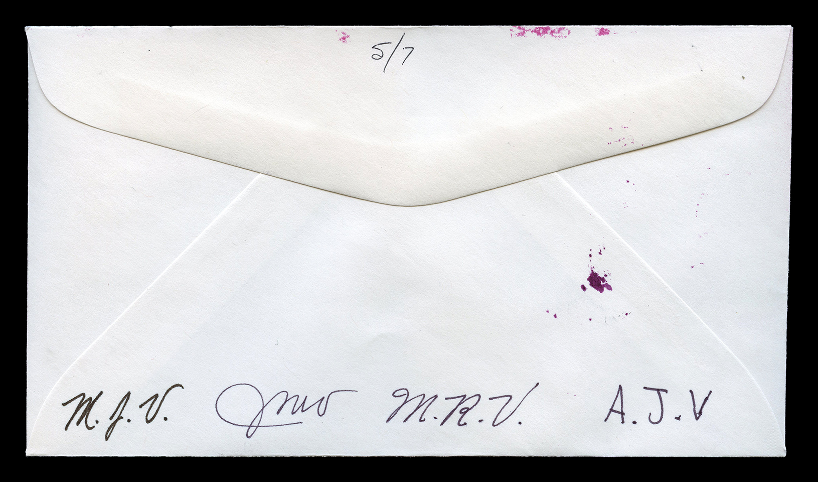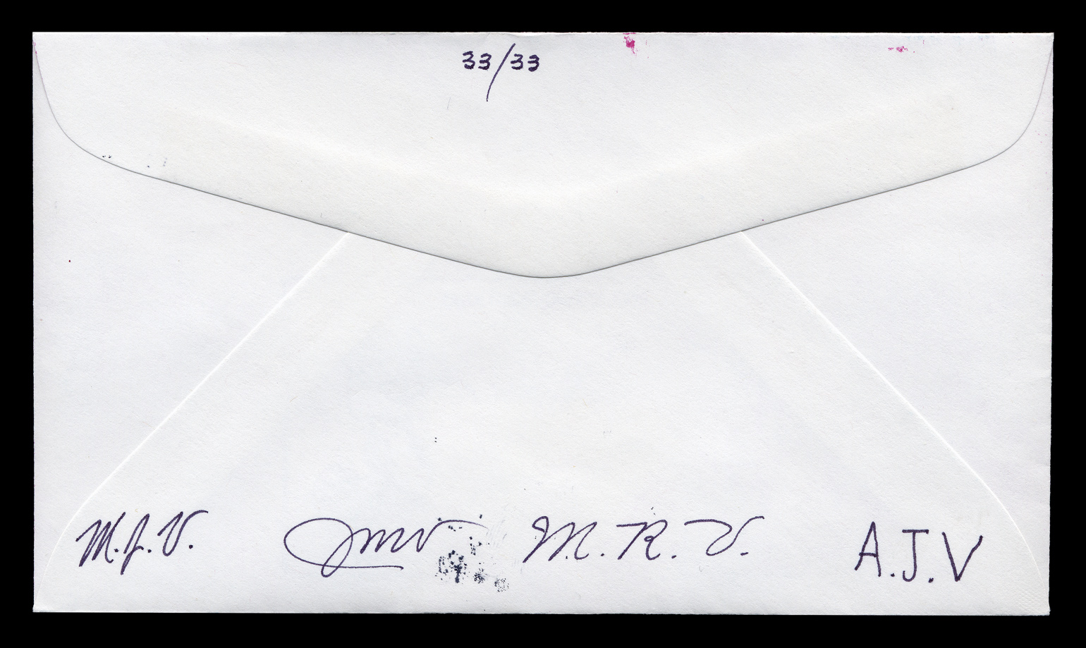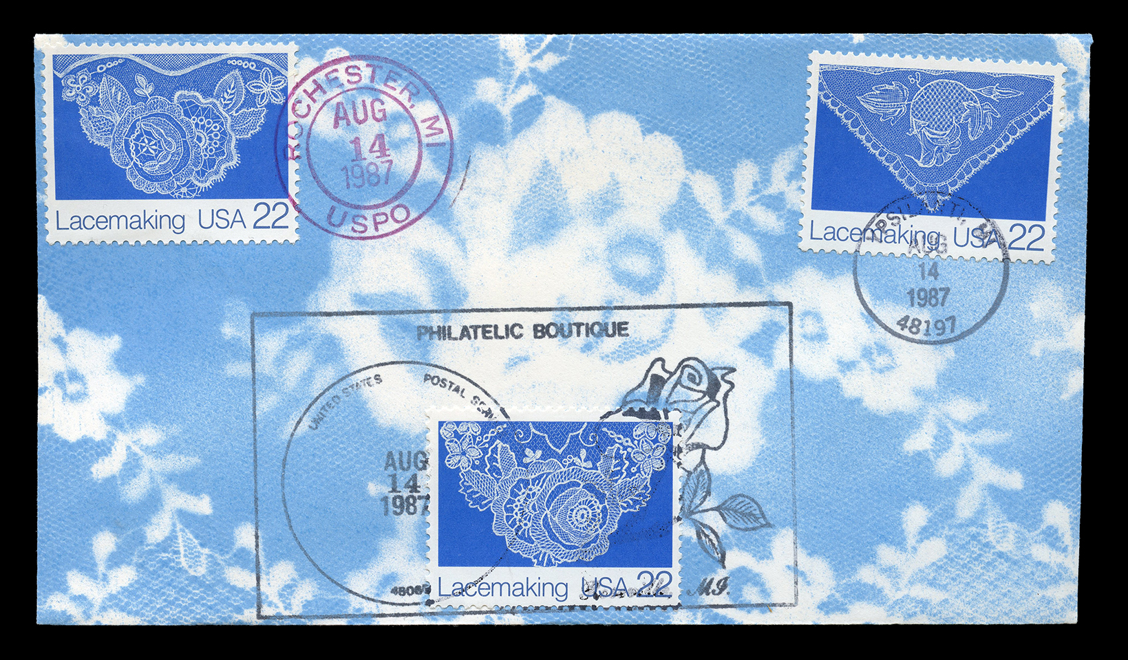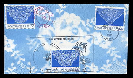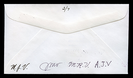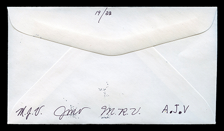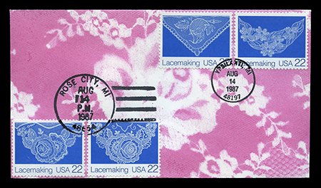 M.J.V., J.M.V., M.R.V., A.J.V. One #6-3/4 (6-1/2" X 3-5/8") unaddressed envelope with three stamps. “First Day of Issue” cancellations and postmark. Pink and blue airburshed? design of a lace template. No indication of the maker of this FDC, other than a set of four initials on the back. I'm keeping the last two even though they are of the same set because one has a black Rochester postmark and the other is red. first posted 9/18/2010 |