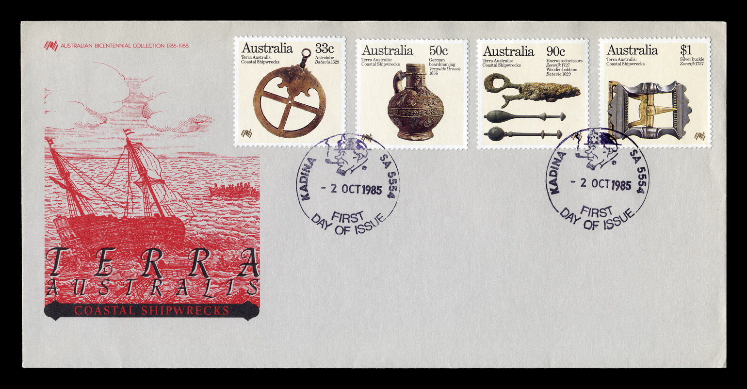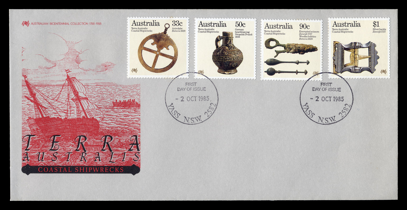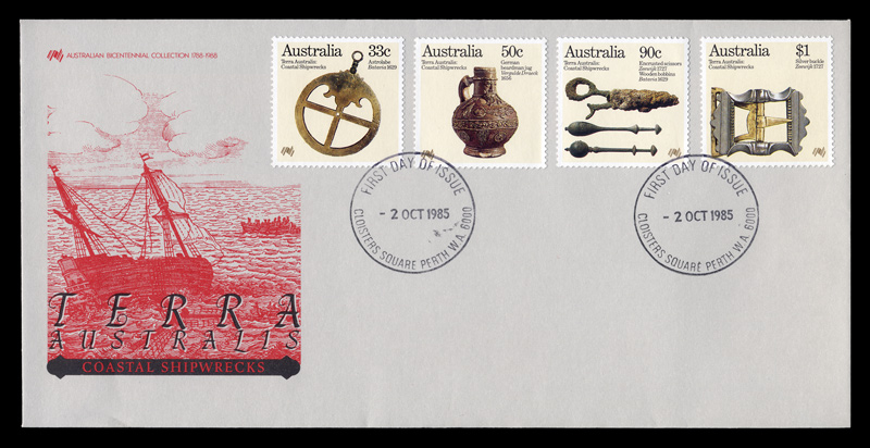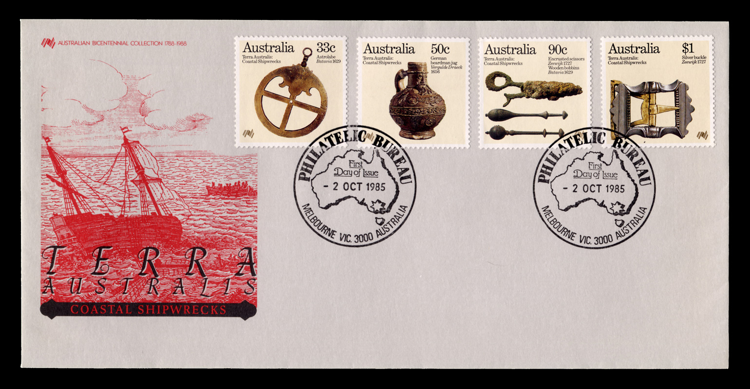 Philatelic Bureau Front and back of the First Day of Issue cover for the Coastal Shipwrecks stamp set, with postmarks dated October 2, 1985. The cover was issued as part of the Australian Bicentennial in 1988. The floundering ship is the Batavia. The print is from the Ongeluckige voyagie van 't schip Batavia (1647) now in the Westall Library. See the Previous item above for more information. The postmark is by the Melbourne Philatelic Bureau. Philatelic Bureaus are a post office’s official source of mail-order stamps, first-day-covers, etc, in this case representing the Australia Post. first posted 1/19/2009 |