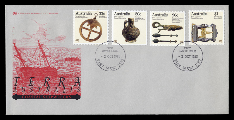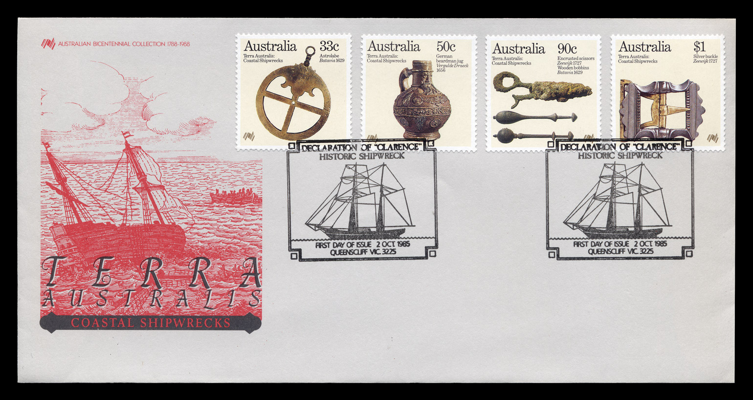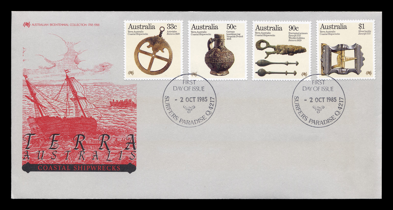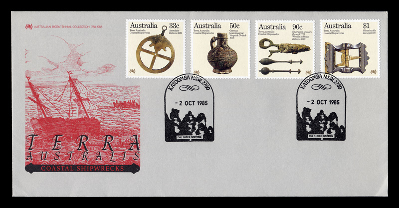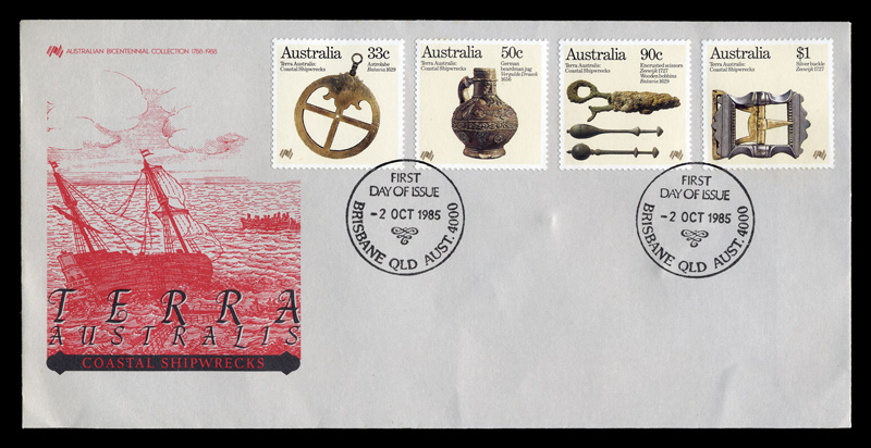 Philatelic Bureau Front and back of the First Day of Issue cover for the Coastal Shipwrecks stamp set, with postmarks dated October 2, 1985. The cover was issued as part of the Australian Bicentennial in 1988. The floundering ship is the Batavia. The print is from the Ongeluckige voyagie van 't schip Batavia (1647) now in the Westall Library. See the Previous item above for more information. The postmark is by the Melbourne Philatelic Bureau. Philatelic Bureaus are a post office’s official source of mail-order stamps, first-day-covers, etc, in this case representing the Australia Post. first posted 1/19/2009 |