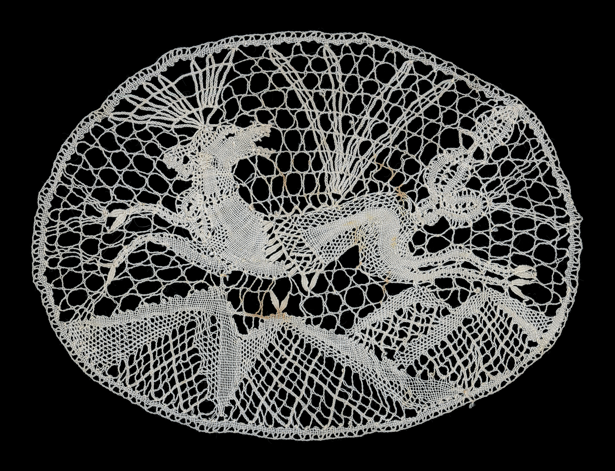 Wiener Werkstätte round motif ~9" wide, ~7.5" high This is a product of the Wiener Werkstätt, led by Dagobert Peche who became co-director thereof in 1916. It is illustrated as pattern #11 - Windhund (Greyhound) in Hartmut Lang's "Die Spitzen der Wiener Werkstätte: Dagobert Peche", Barbara Fay Verlag, 2016. This pattern was taken from an earlier work, Marie Dormoy's "Dentelles de l'Europe centrale", Paris 1925, plate 14. Lang attributes the design directly to Dagobert Peche. The seller says this was purchased as part of a large lot from the estate of a well-known interior designer in New York, but gives no further details. purchased 10/09/2019 |