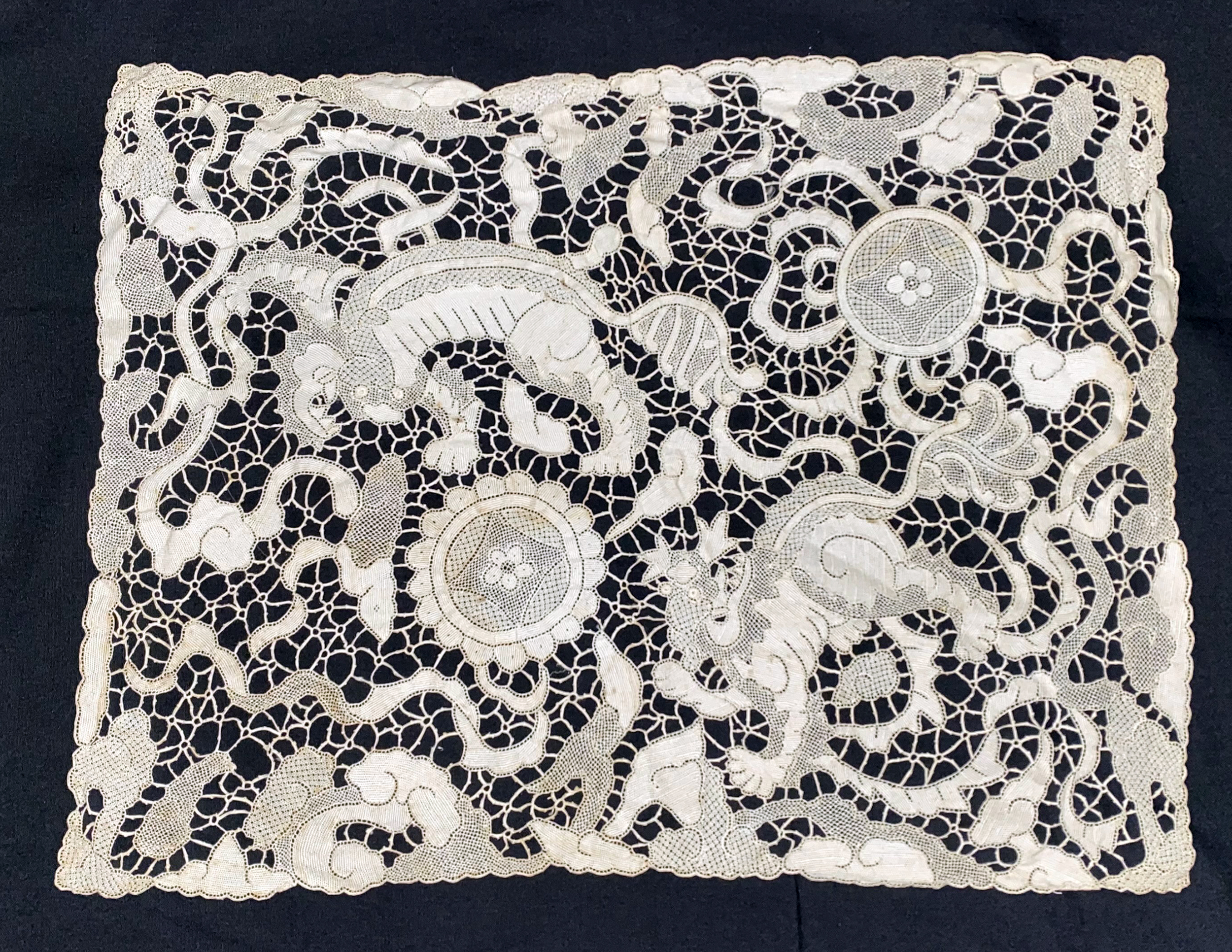 Art Noveau Mat 11.5" x 16" Despite the Chinese Foo Dog lion motifs, this is probably an Austrian needlelace piece. Interesting design very well done. It might be a part of a larger set.