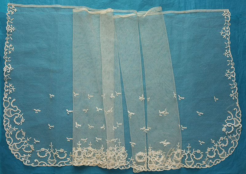 Bobbinlace Applique on Machine Net Hat Veil 154 cm x 50 cm I wonder if this is a Honiton piece - hard to stay. Technique seems more Belgian, but there are no needle-made fillings. purchased 11/13/2018 |