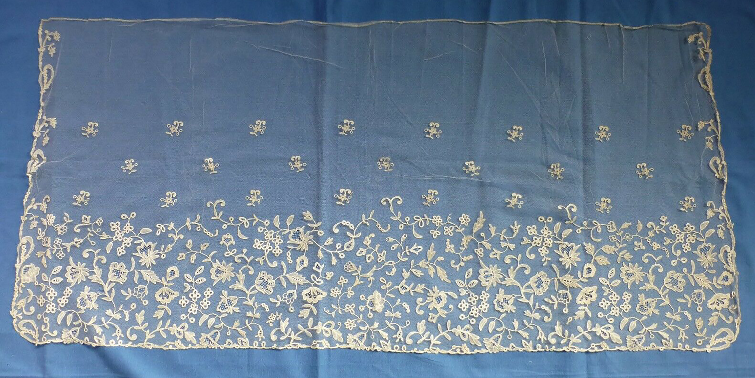 Bobbinlace Applique on Machine Net Hat Veil 58 cm x 120 cm Not the most sophisticated design, but condition is very good. Simple knotted (some with picots) fillings. Probably similar to Belgian_machine_applique border_4 and Belgian_machine_applique_bonnet_veil_7. Came from the same seller. From a collection of family owned lace, from an estate clearance. purchased 02/19/2019 |
