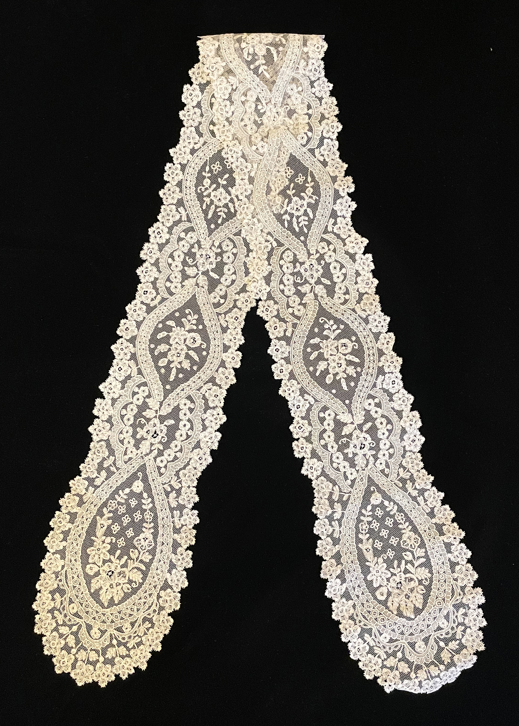 4.75" max, 4" center x 43" long (10.16cm to 12.06cm x 109.22cm) A lappet scarf of Brussels bobbin and needle lace applique on machine net. Excellent design and technique. Needlelace bands outline all of the central motifs. The tulle isn't always cut away from small openings, but this is minor.