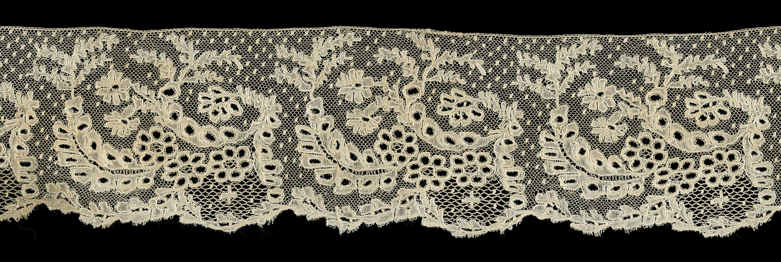 3.25" x 68" (8.25cm x 172.72cm) Scalloped border which is unusual for Beveran, but the pattern and extensive esprits look more like Beveran. It could be Lille, but I'll leave it here for the moment.