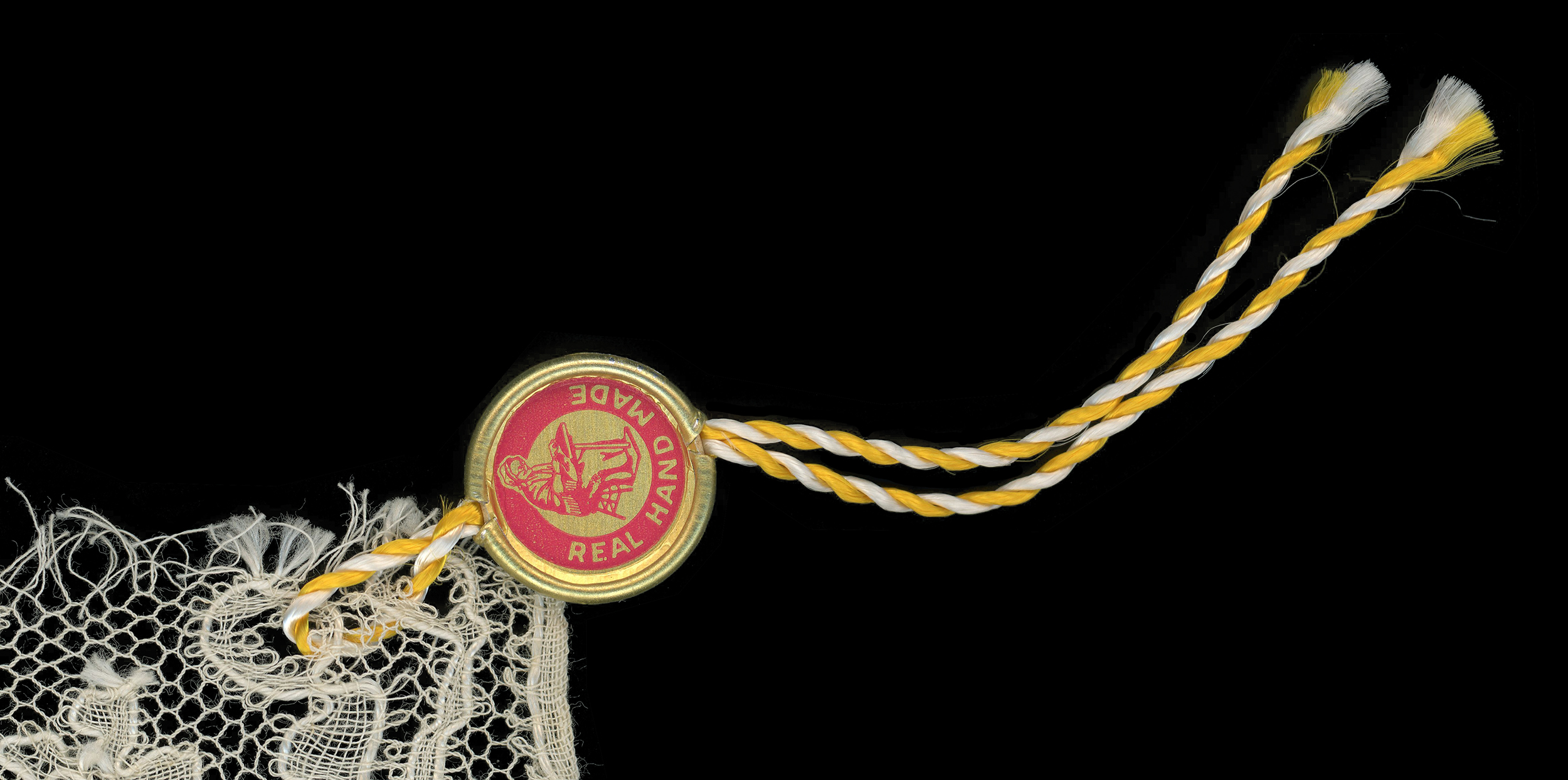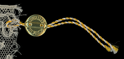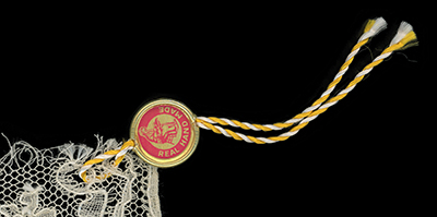 A wide Beveran border, I don't recognize the tag. Maison Foriet had something like the lacemaker image, but that is just speculation. The tab does have a phone number that could be tracked down.