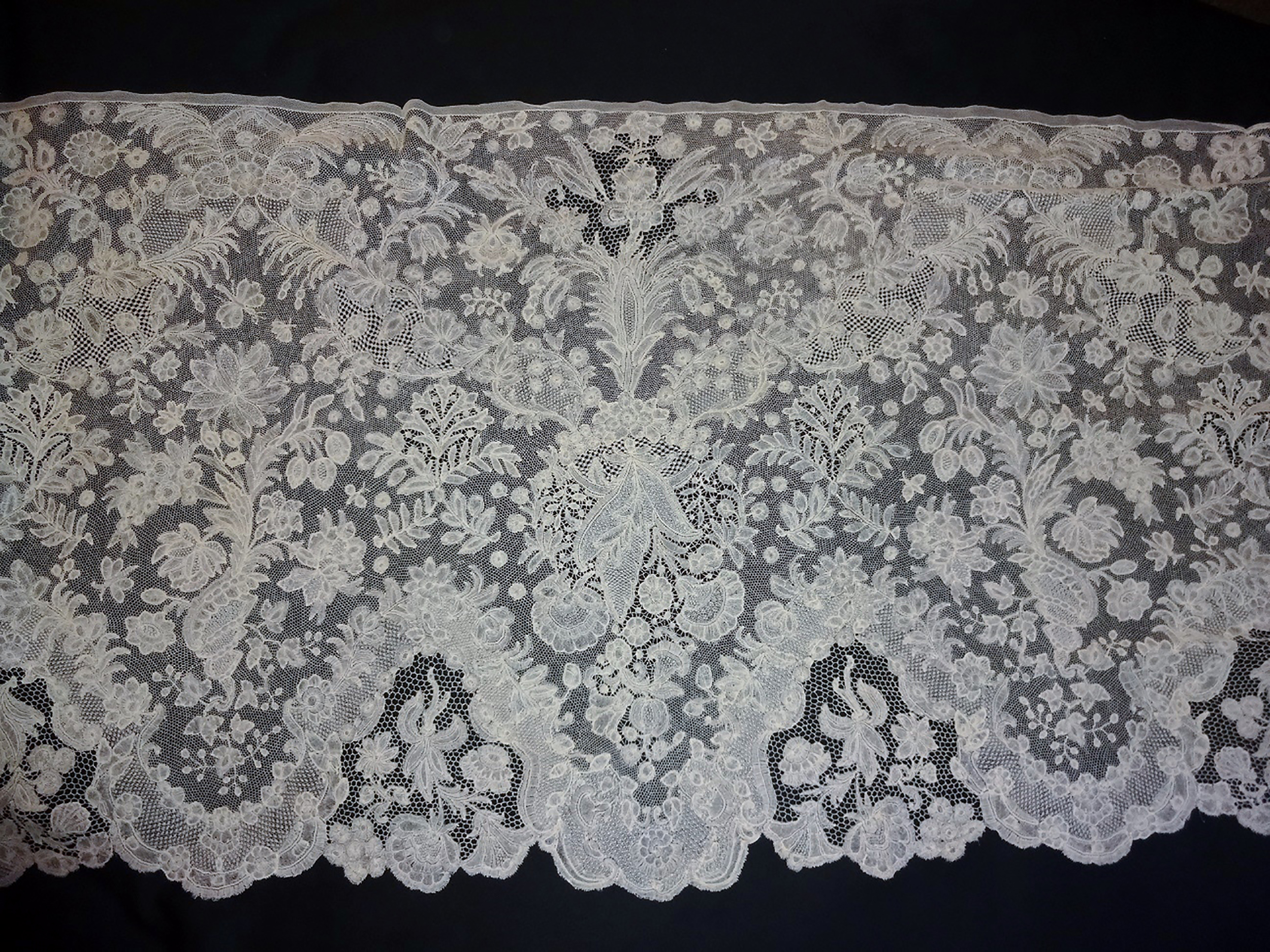 26.4" x 130" (67cm x 330cm) Brabant pattern, including some butterflies. Fond chant and bride grounds, partridge eye and snowflake fillings. Design is a little asymmetric in places.