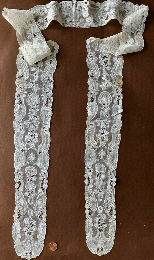 Brabant Bobbinlace Flounce lappets 21" x 4.25" max, frill 32" x 2.75" Because of the fond chant ground and the less sophisticated pattern, I'll put this in the Brabant section. The motifs up the center of the lappets don't repeat, thread quality and technique is good. The 'Next' item is a cap back so close in design and technique, that I'll try to put these together as a complete 'head'. published 04/24/2019