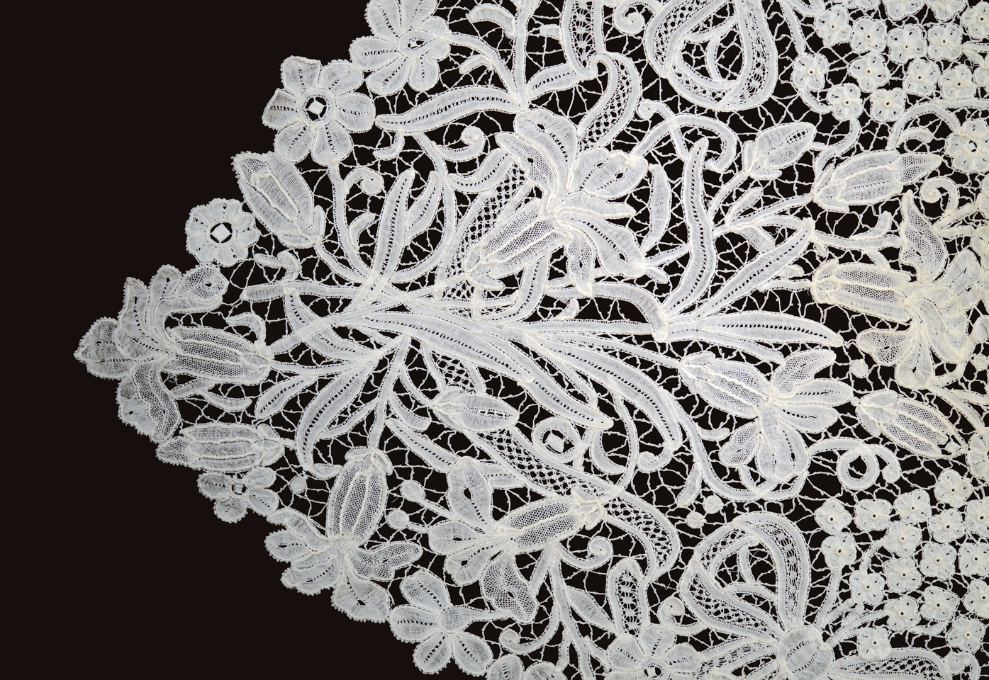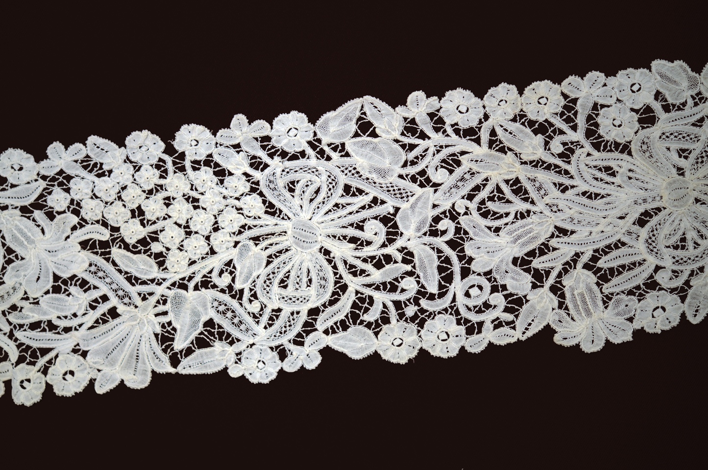 Strange shape, design of lillies? and bows. Raised centers in the 4-petal flowers, recalls Rosaline.