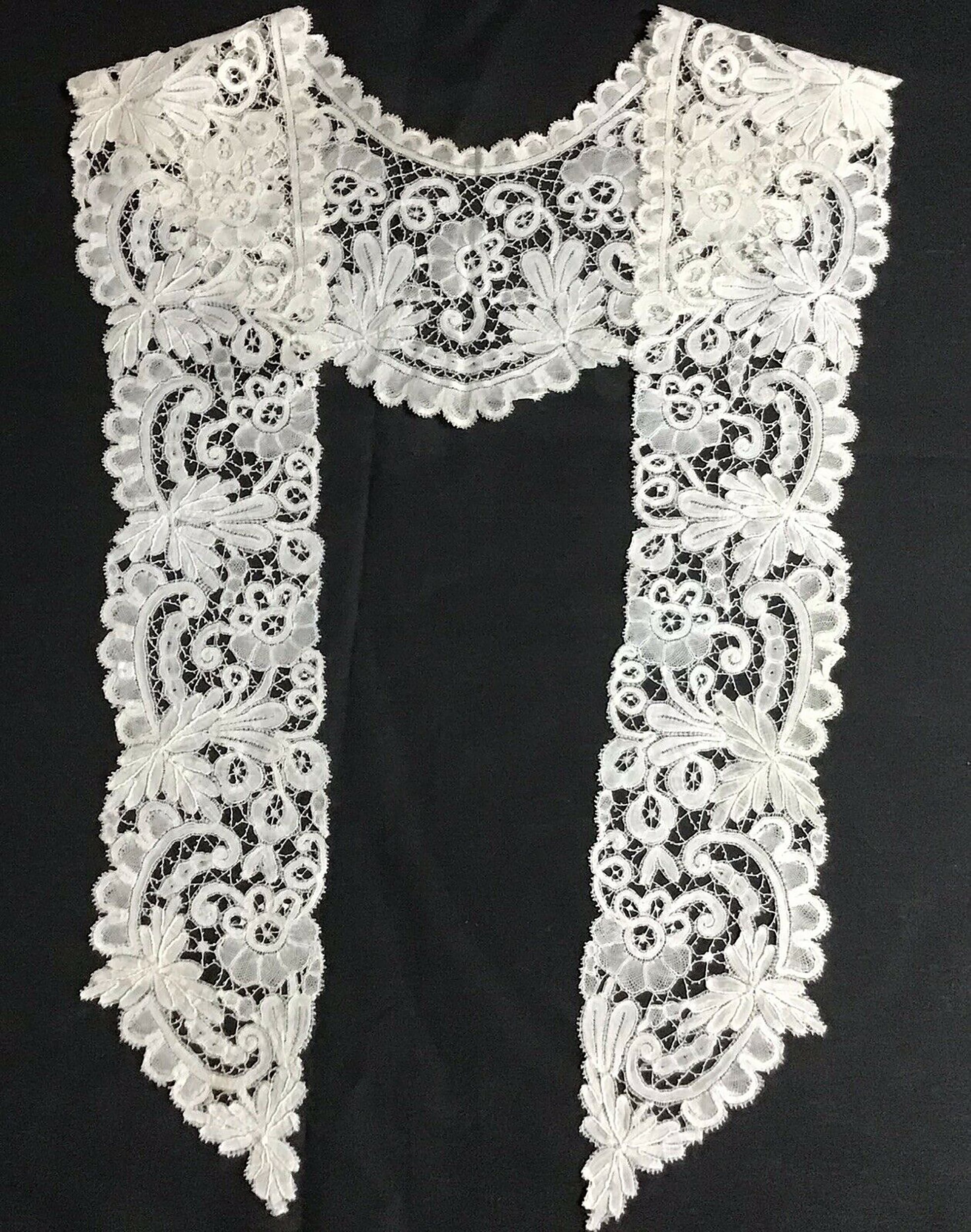48" long, 5" deep at back neck. A pieced bobbinlace collar with long frontpieces, probably Bruges Bloemwerk, very well done. Note the dense clothwork and accurately done contrasting halfstitch shading. Picoted roughly square bride grounds with occasional islands, which are also used as the flower fillings.