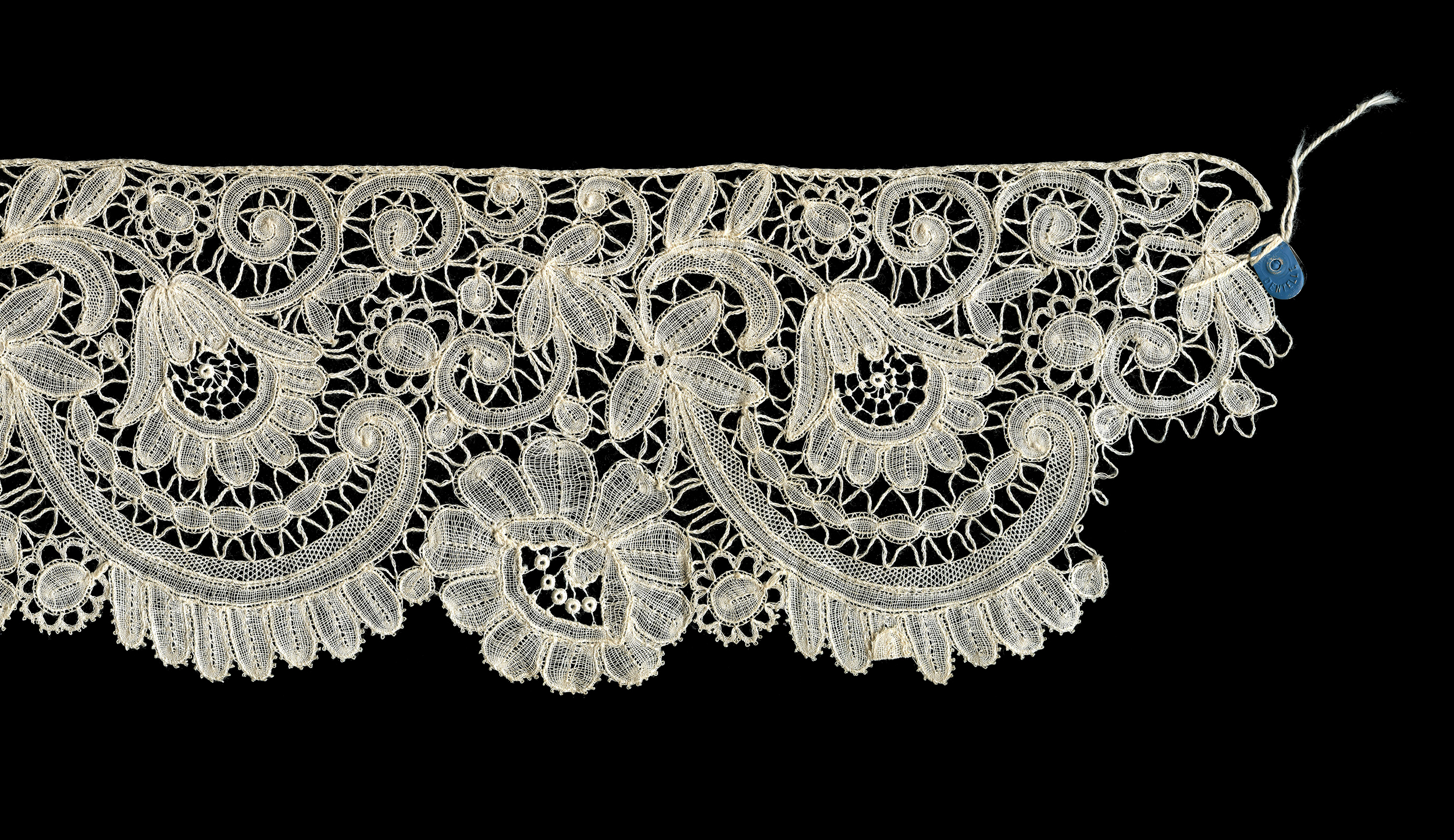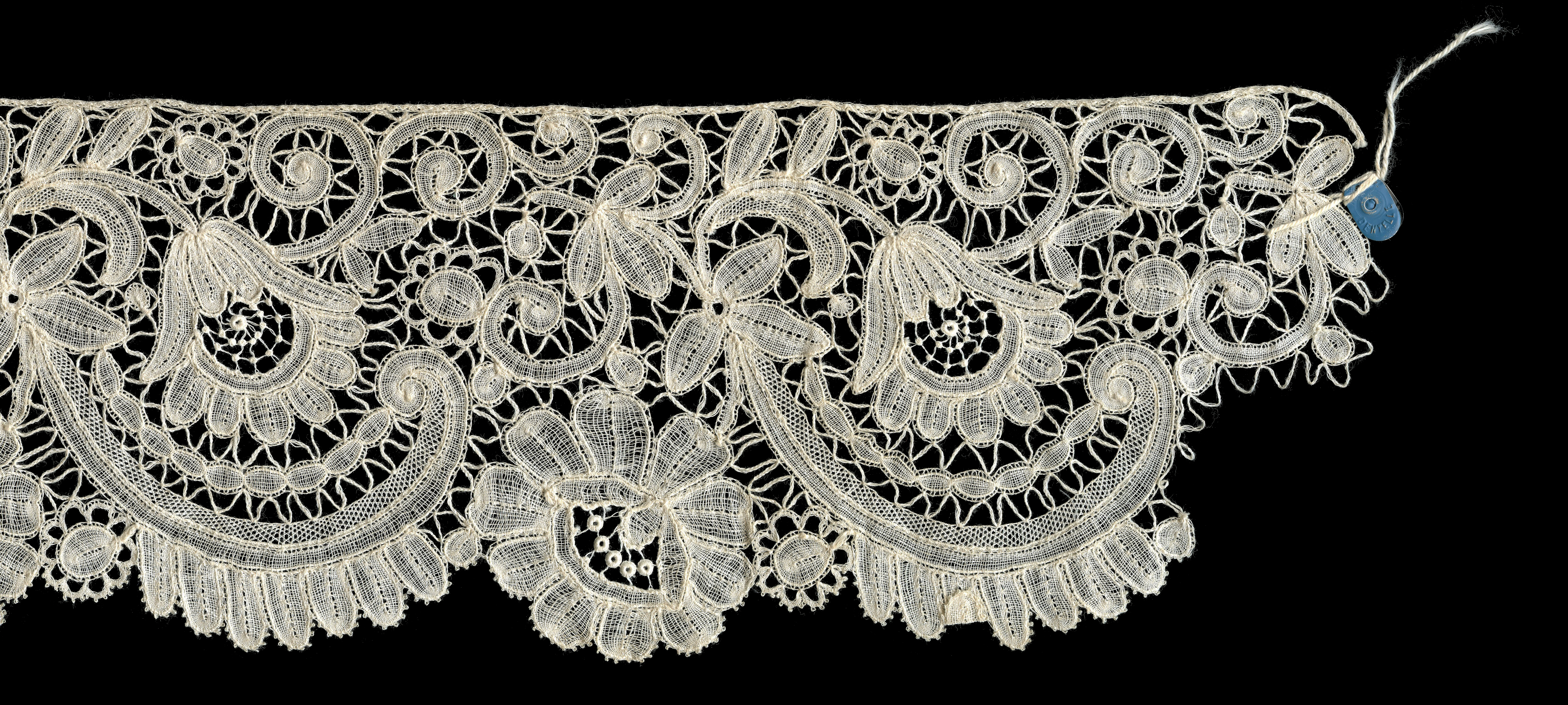4" x 107" to 109" (10.46cm x 271.78cm to 276.86cm) Typical bruges border, note blue tag (dentelle, véritable).