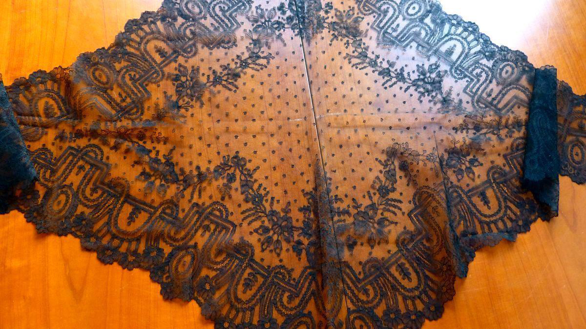 Diamond headpiece, wide lappet ends. Simple design. Heavier, blacker thread typical of Belgium Grammont.