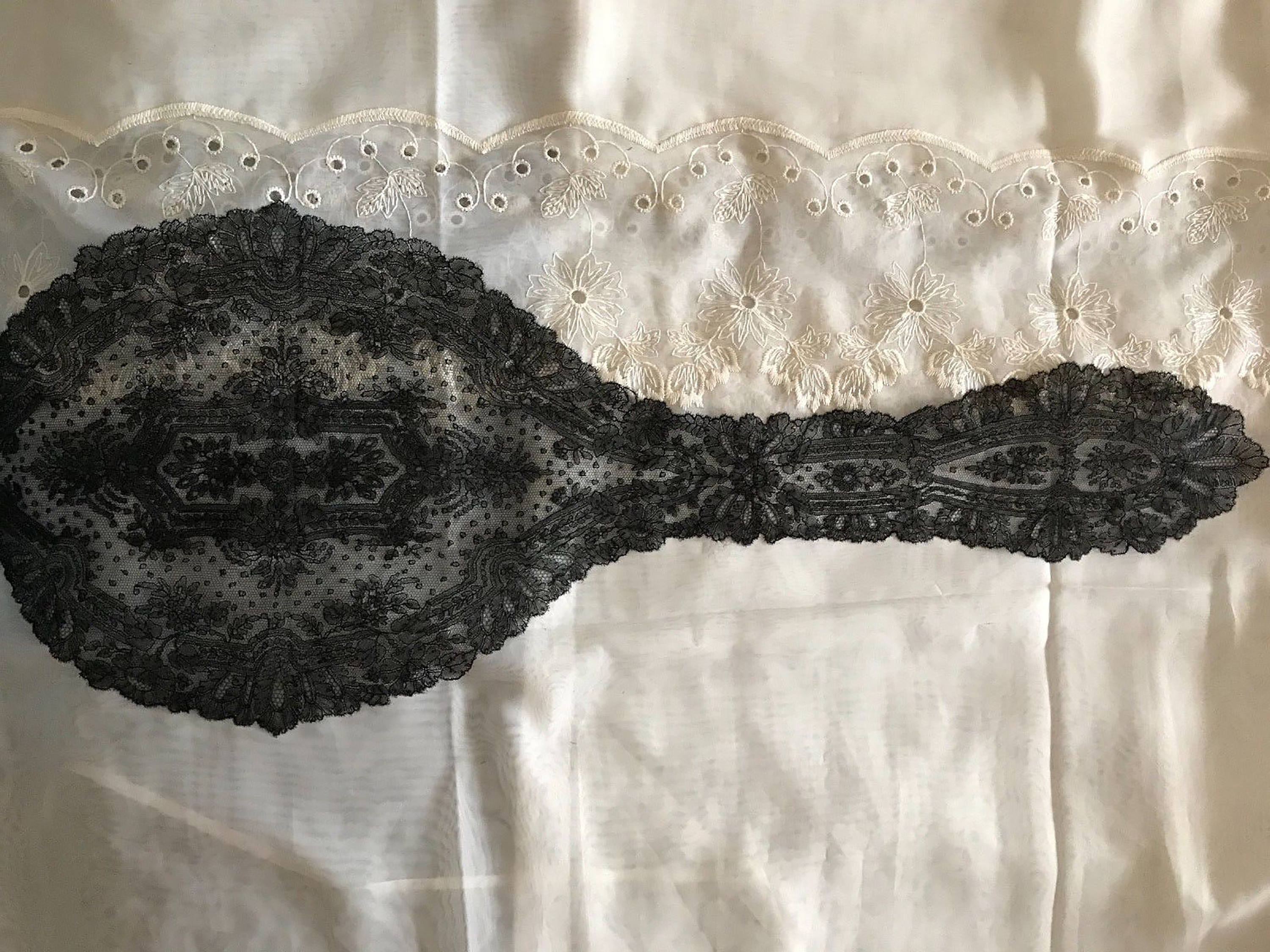 Oval headpiece and narrow lappets with bulbous ends. Fair design. Heavier, blacker thread typical of Belgium Grammont.