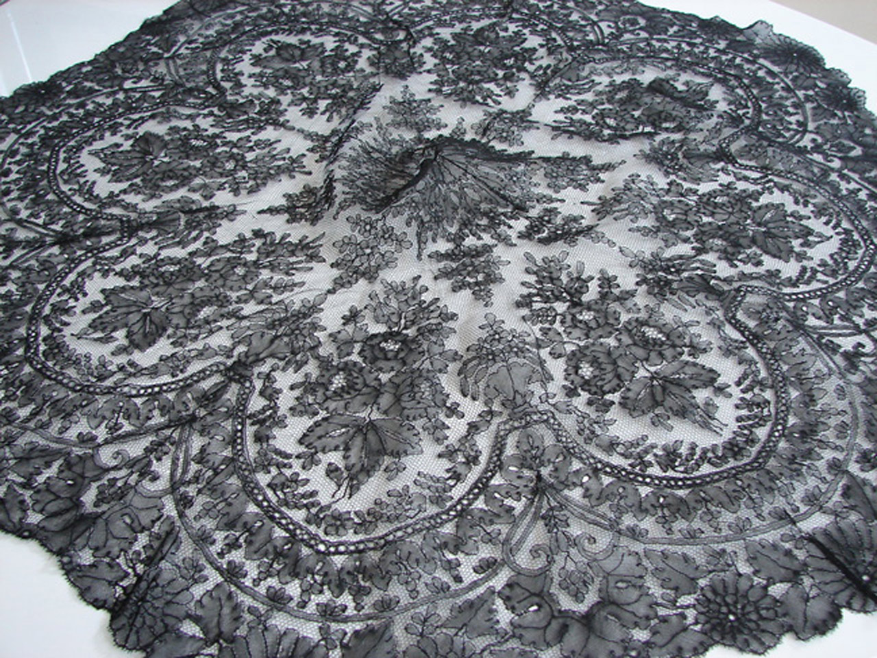 Heavy black floral, slight pucker in center as expected. Heavier, blacker thread typical of Belgium Grammont.