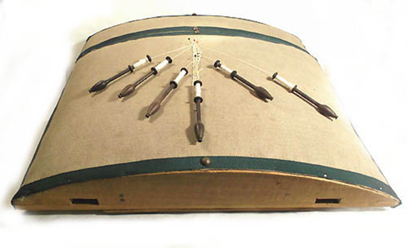 Need measurements A typical 2-part Belgian kantkussen with a beige cover and dark green tape nailed and tacked down to the frame. This might be the original canvas cover (check this). There is a drawer in the upper part of the large section, and another drawer in the base stand. It came with a simple 3-pair lace with 6 bobbins, no pattern.