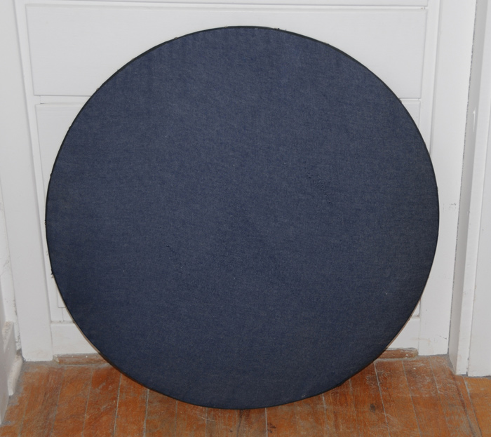 ~29" (73.66cm) in diameter, but this needs to be checked. Purchased at the Manufacture Belge de Dentelles, along with the brass dividers. It has a plastic strap screwed at both ends into the back wood for a handle. Hard on the knuckles. Stuffed with straw.