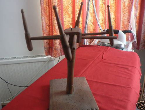 need measurements A standing swift. The thread skeins are held by modified bobbins mounted on the ends of long sticks which thread into the central revolving block. It's actually pretty funny. This was purchased soon after rouet_1, from the same seller, and has the similar wormhole damage and fluted edges on the base.