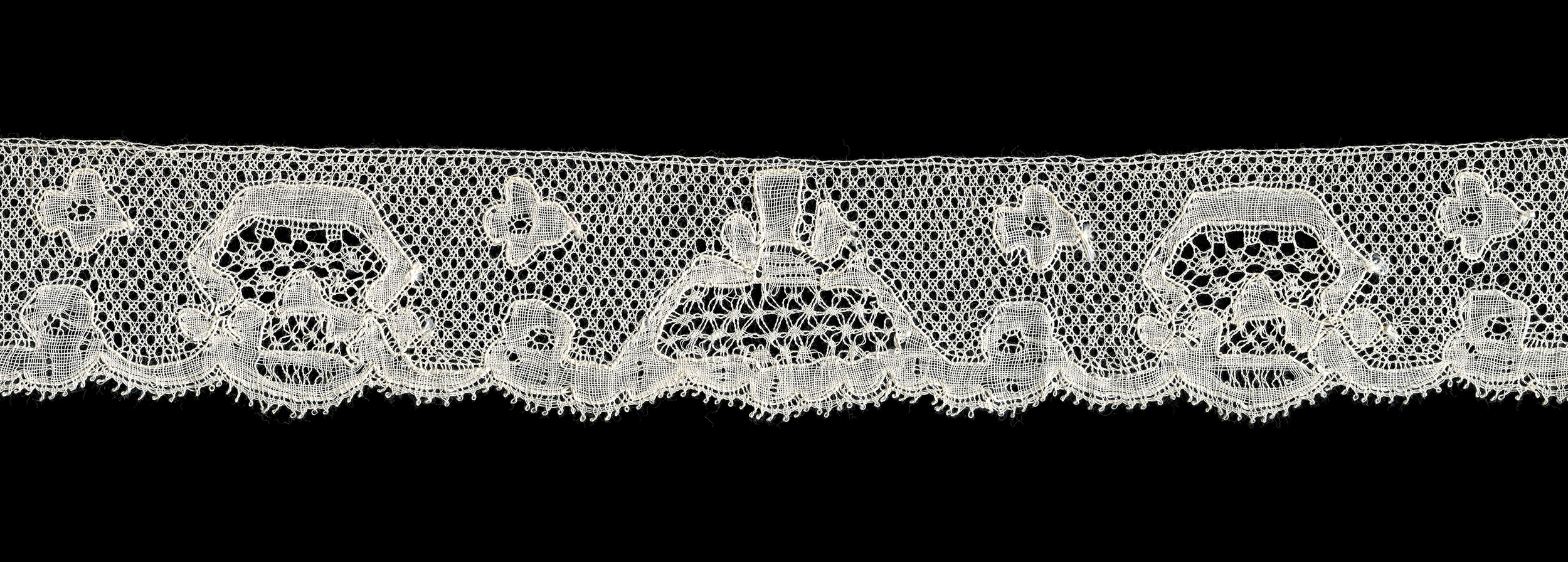 Flanders border 2" x 124" Flanders ground, with gimp. This is virtually the same lace pattern as the border 3rd from the to, page 21, "Belgian Lace Made in Belgium During the War". purchased 11/26/2018 |