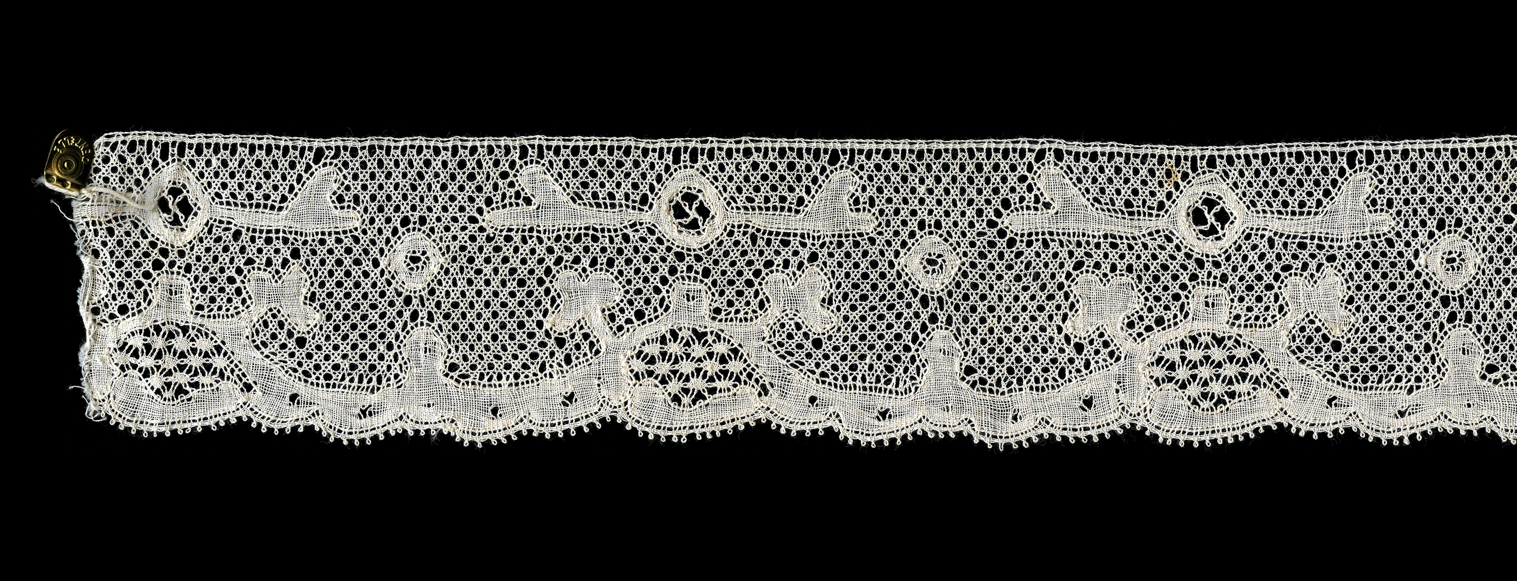 Flanders border 5 cm x 150 cm Flanders with 5-hole ground, simple design with gimp, straight over some kind of leaves? A bit coarse. Gold tag one end. purchased 04/04/2011 |
