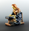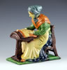References to Flemish Pottery (information is more commonly found under "Vlaams Aardewerk" in Flemish, or "Poterie Flamande" in French) date back over a thousand years. Brugge was a major center of export. The pottery is a lead-glaze earthenware and is used for household items as well as decorative figures. Note, the lead-glaze is toxic if ingested, but an acceptable substitute that preserves the brilliant colors has not been found. A history of this art (in Flemish) can be found at http://www.vlaams-aardewerk-gjm.be/index.html. Vlaams Aardewerk includes vases, jars, candlesticks, wall pieces, and other traditional forms, as well as many different figures, primarily local crafts people and religious images. The lacemaker is not the only textile-related figure; flax spinning was also modelled. The one shown below (not in my collection) has a saxony type wheel. A spinster at an upright wheel can also be found, and I have also seen a woman winding yarn from a swift. Occasionally the Lacemaker and a Spinner will be made as a pair.