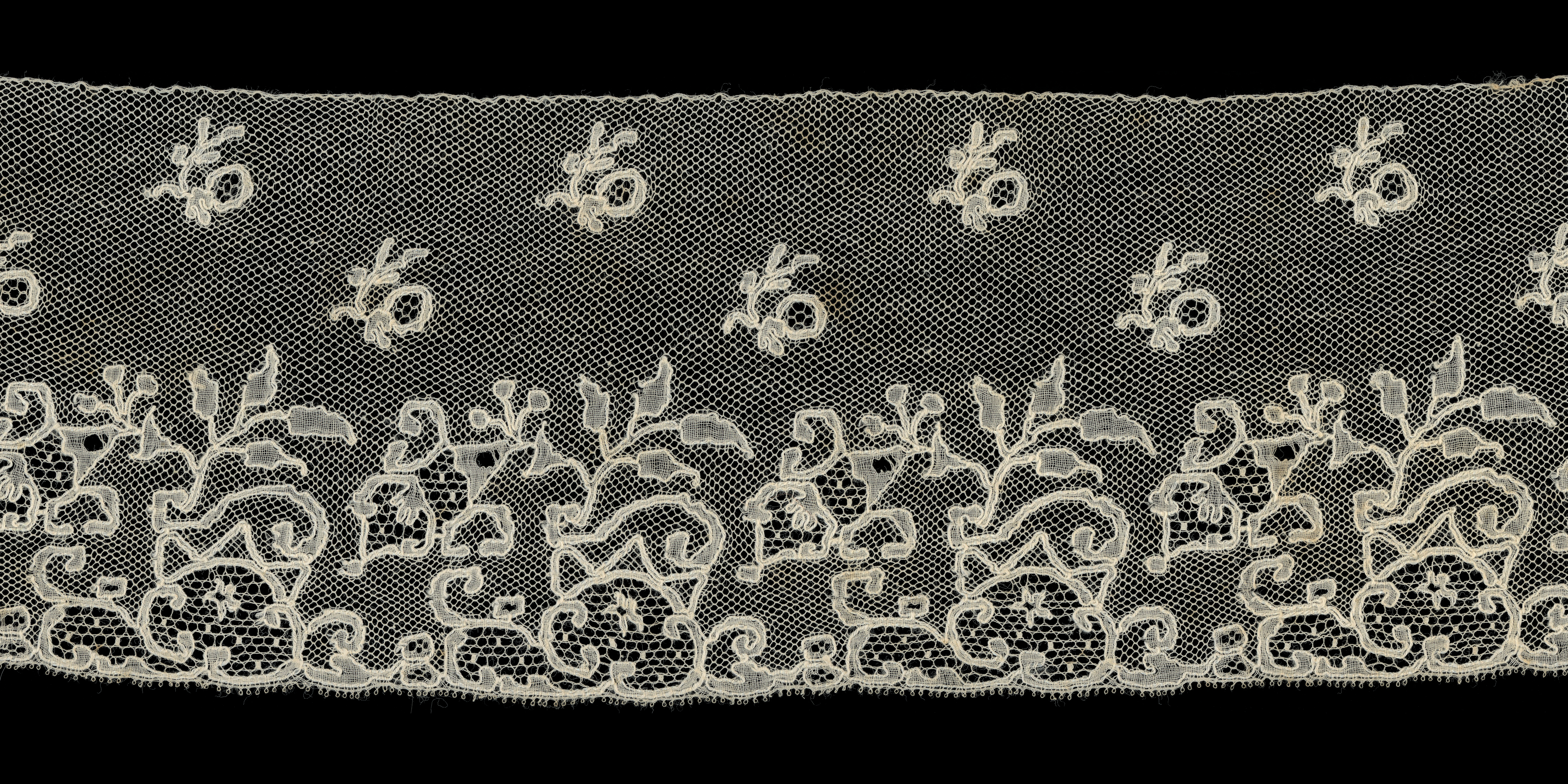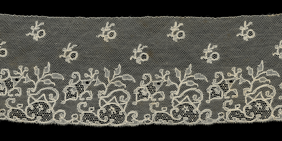 A wide, cotton Mechlin border. The floral design is a little blocky and simplified, and the sharly pointed leaves often leave a long gimp trail on the backside. Ineresting fond chant fillings with tallies. Two rows of large esprits of a bud with leaves.