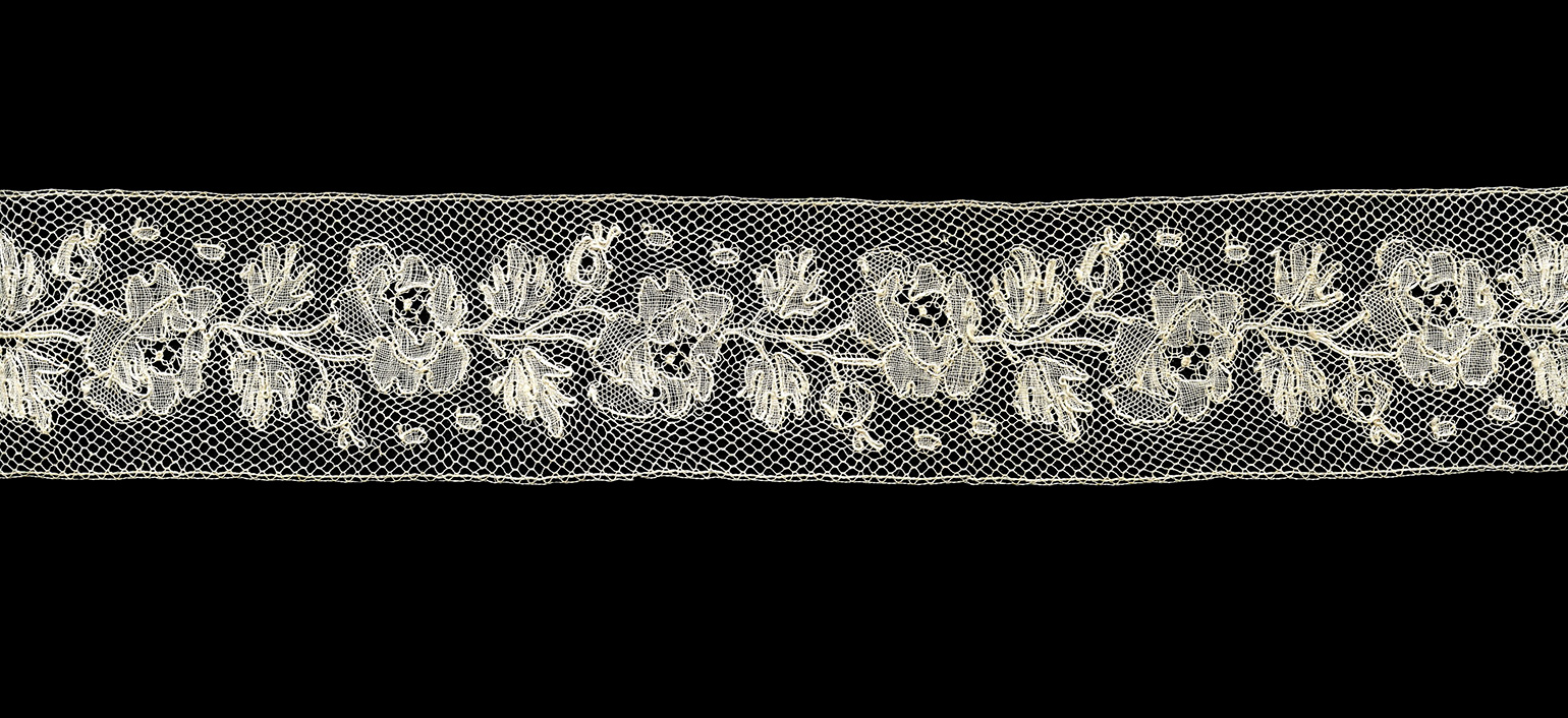 2-9/16" x 136" Rose and leaf trail, simple objects as esprits. Some half-stitch shading, tally in rose center. gift from Suzanne Grayson's little collection in Santa Fe.