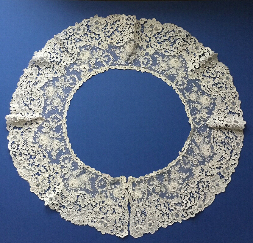 Belgian Mixed Needlelace bertha 38" neckline, 5.5" deep Combination 'Venise' and Point de Gaze. Elaborate design with raised petal roses. Good contrast between the heavy outer border and more typical 'continuous' Point de Gaze on the inner border. purchased 03/26/2019 |