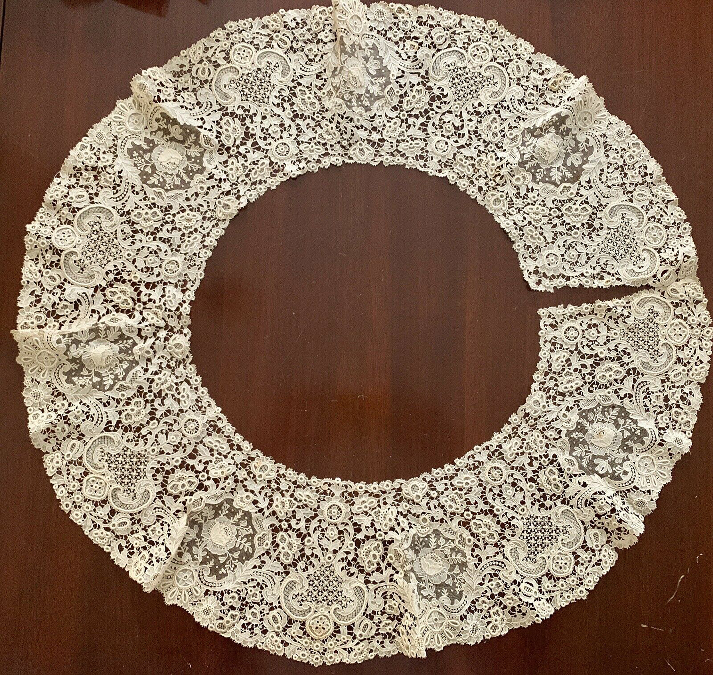 Belgian Mixed Needlelace bertha Inside diameter 15", outside diameter 28", depth 6.5" Combination 'Venise' and Point de Gaze. Each Point de Gaze insert has a raised petal rose, one bud, and some leaves and rings. Raised work outside these inserts is dense with areas of complex jours and clothwork. Good, fine technique with extensive raised cordonnets, sometimes sculpted. Ex. coll. Debra Bonito, author of the book "Graced by Lace". She was a lace author and textile collector and dealer who visited Japan three times to lecture on the subject. She once appeared on Martha Stewart to talk about cleaning linens. purchased 04/12/2019 |