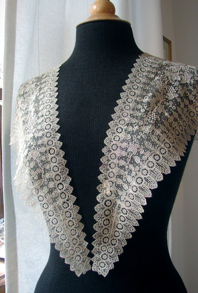 Belgian Mixed Needlelace shawl collar ~45.5" long x 11" max width Very fine ground, jours, sort of an architectural pattern. Grapevine motif down the center. purchased 05/04/2010 |