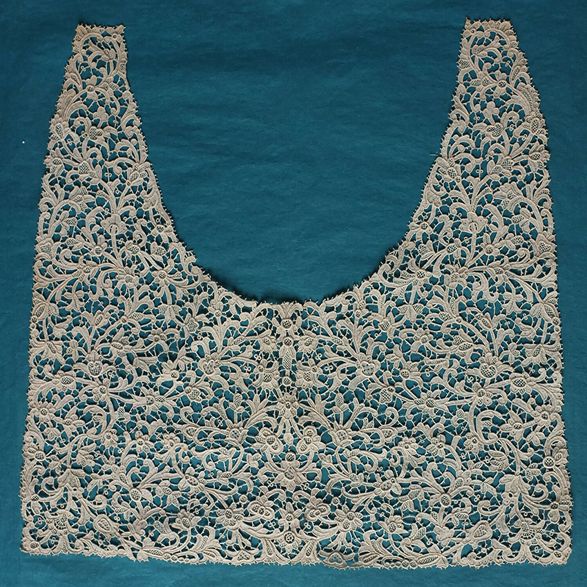 Belgian Venise Dress Front 53 cm neckline, back neck to edge 18 cm Belgian Venise frontpiece, although it doesn't have the typical Point de Gaze variations. Might be Italian. Loops and straight picots on the brides. Straight picots on the edges. Simple, constant width buttonholed cordonnets. purchased 07/01/2019 |