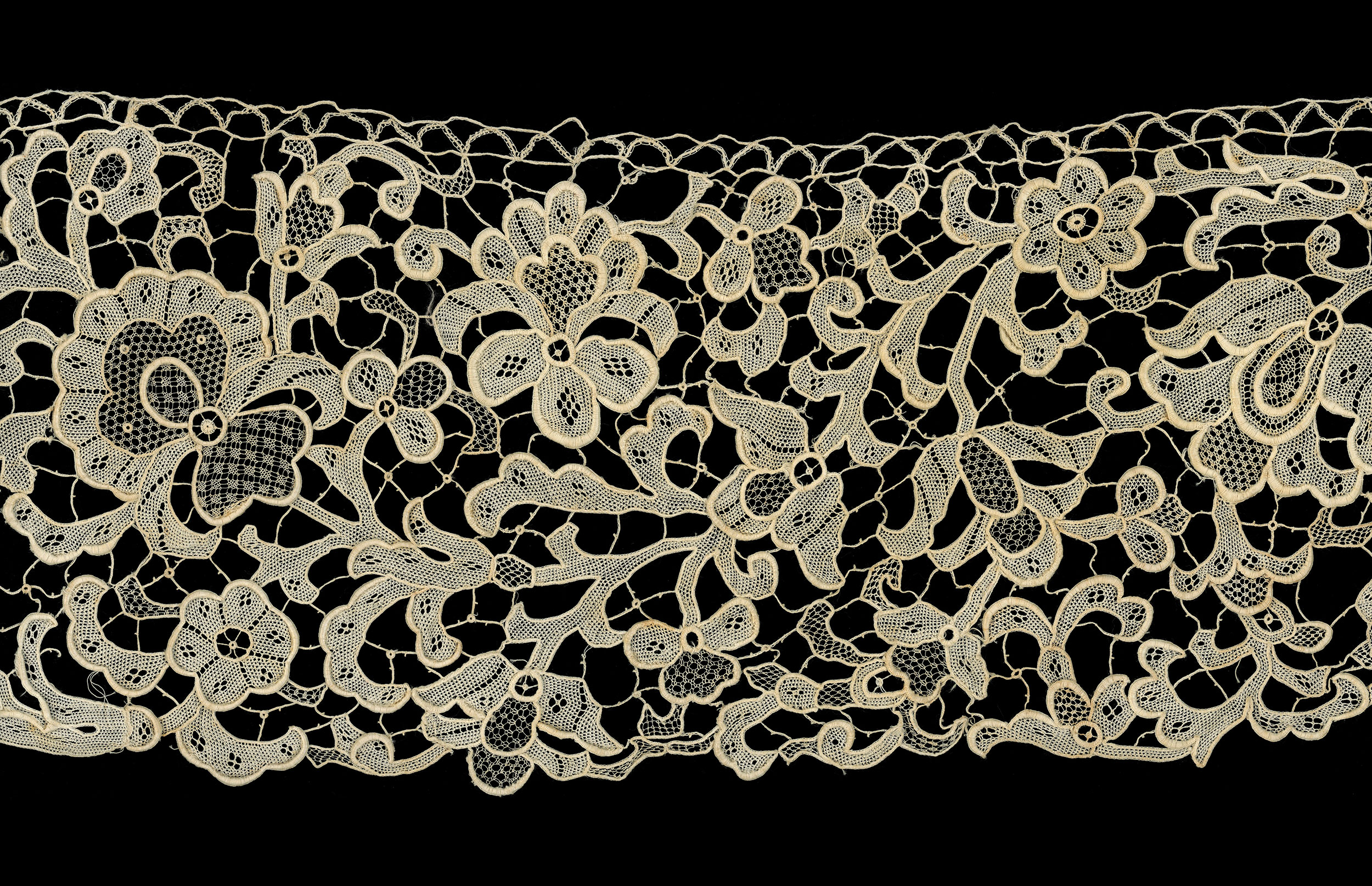 5.5" x 42.5" A Belgian border of "Venise" needlelace. Belgian indicators include the Point de Gaze stitch used for some fillings, and the upper border has brides outlined with 1.5 twist stich, often found in Point de Gaze. The patterned filing stitches appear to have been made with a thinner thread. Cordonnet is well sculpted.