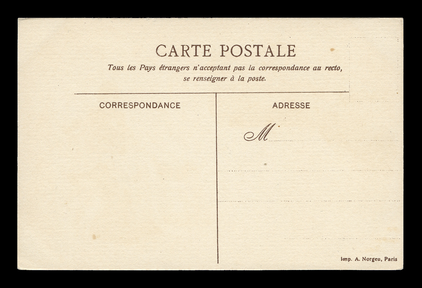 The backsides of postcards are remarkably consistent across different producers, and often provide a clue as to the date of issuance. I have scanned unwritten examples to associate with each card - these are the same as the ones used on each card, but without any writing that might be present on that particular card. Divided backs started to appear in France in 1907, and were in general use by 1910. Click here to return to Norgeu advertising cards. first posted 2/20/2009 |
