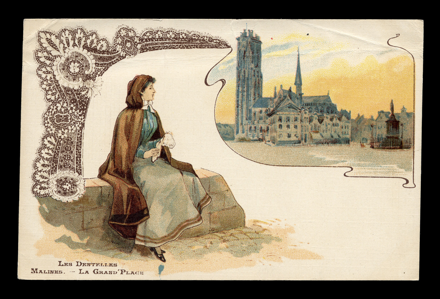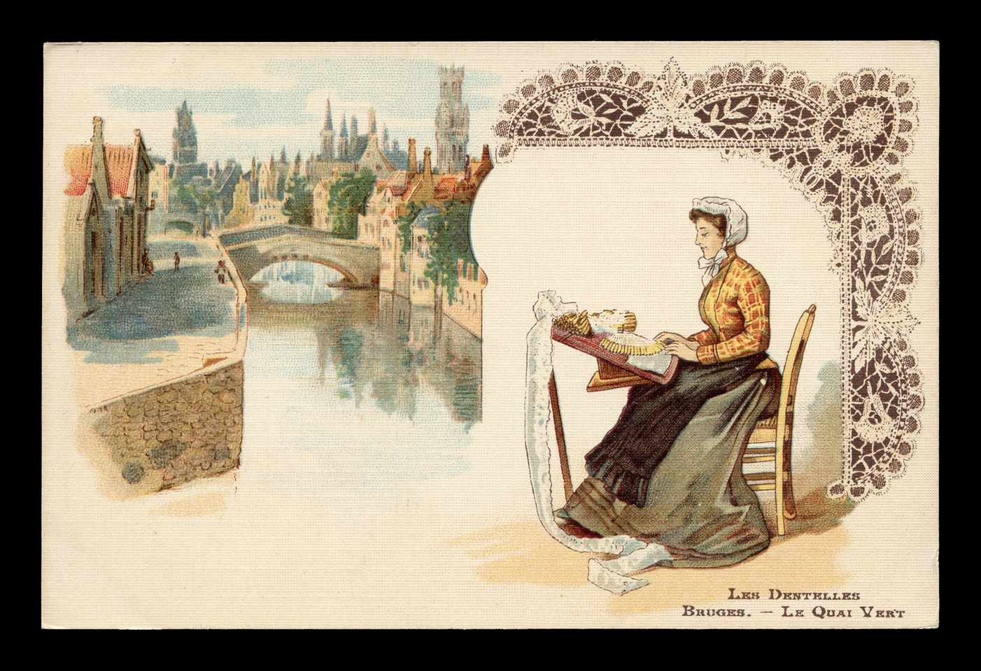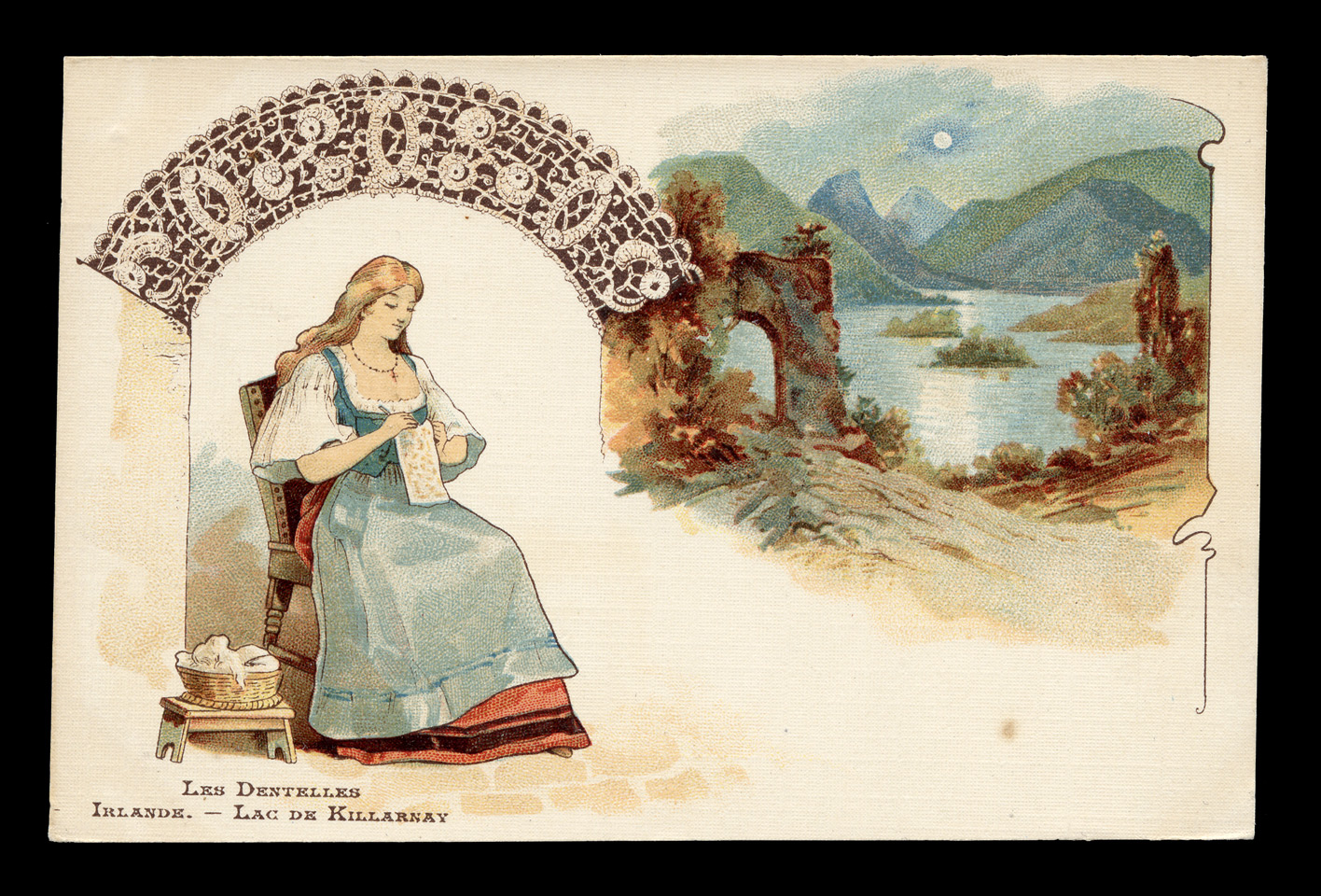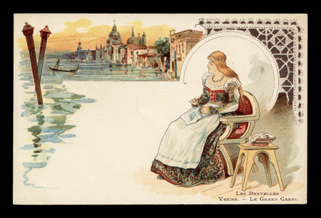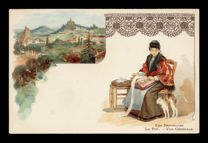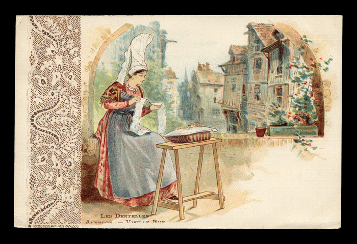 A. Norgeu, Paris "Les Dentelles". Set of six 5-1/2" x 3-5/8" cards of watercolor paintings representing lacemakers from different regions, in costumes which are not entirely accurate. Each includes a piece of lace, and a local landscape. Le Puy, Venice and Ireland have reasonable facsimiles of the local lace, the others just look pretty. Some of the cards are a bit skewed in cutting. Even with the design liberties, these are quite nice cards. I'm guessing around WWII.
