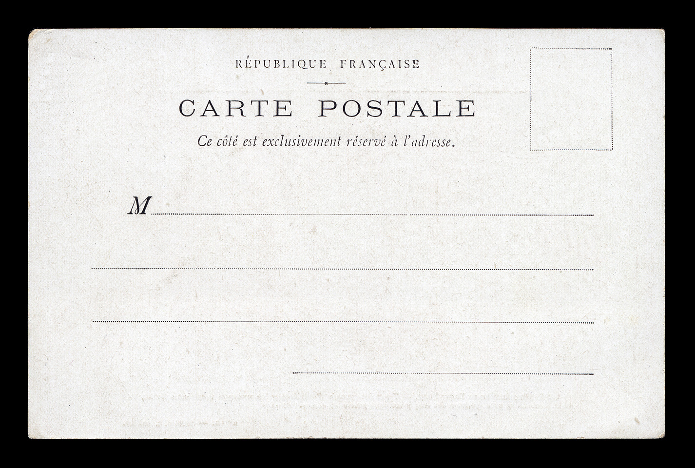 The backsides of postcards are remarkably consistent across different producers, and often provide a clue as to the date of issuance. I have scanned unwritten examples to associate with each card - these are the same as the ones used on each card, but without any writing that might be present on that particular card. Undivided back Introduced 1881: Printed text - Ce Coté est exclusivement réservé a l’adresse Click here to return to Maurin Quina postcards. first posted 2/6/2009 |