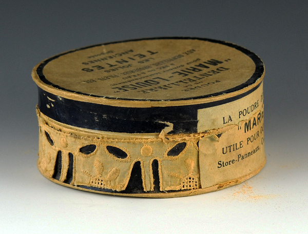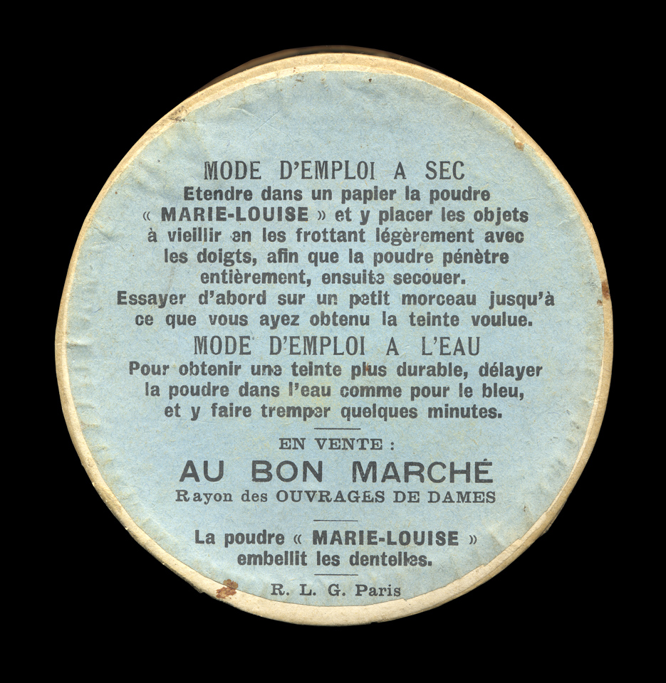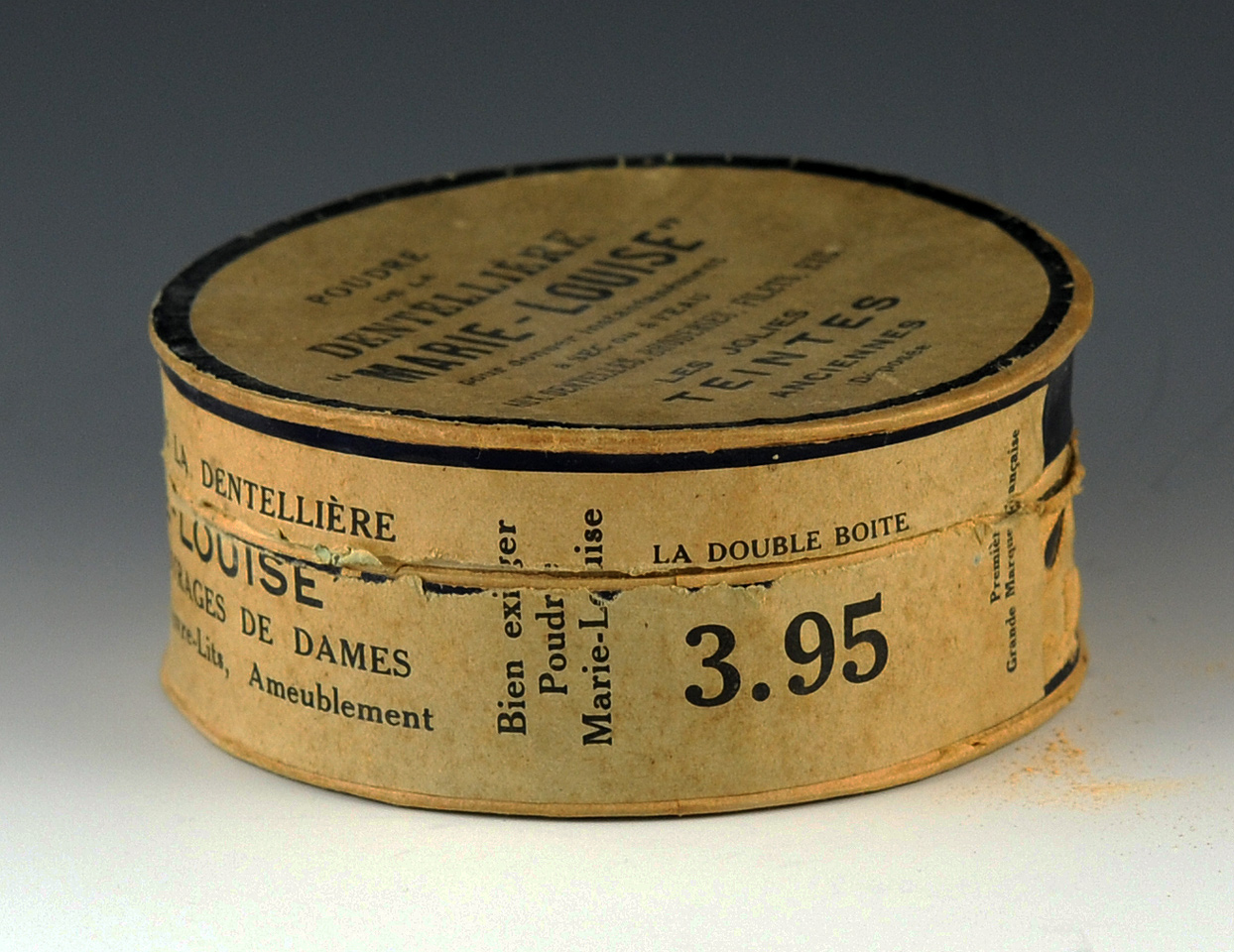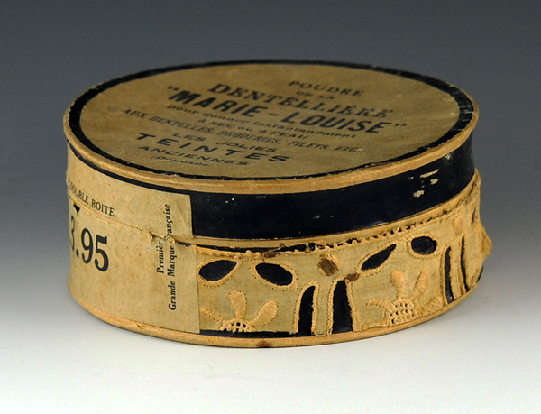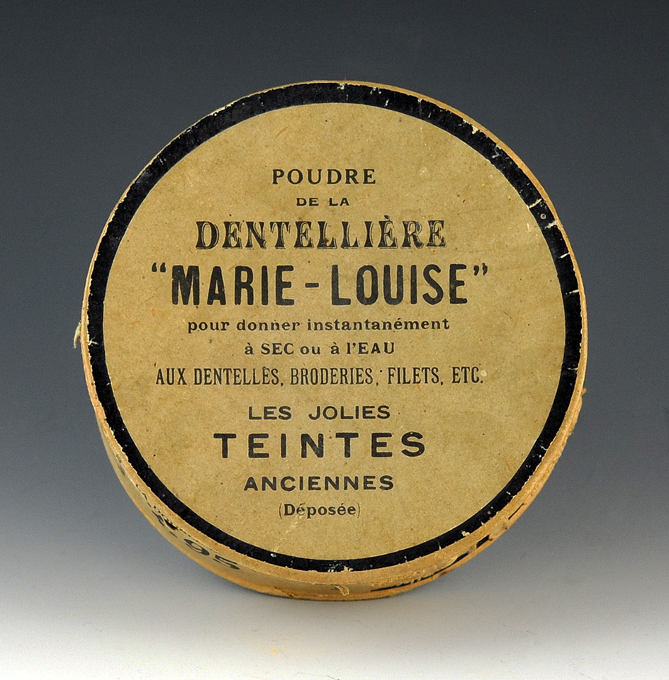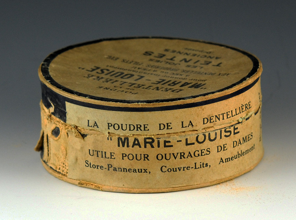 Lace dye A good companion for the Ivory Soap Ad (click 'Previous' above). While that ad is concerned with cleaning lace, this item allows the user to dye lace to give it an older look. The box is full of light-brownish powder, smelling strongly of talc. The directions on the bottom say you can use this dry or mixed in water. An actual example of a died piece of cutwork is attached halfway around the side of the box. The seller estimated it dates from 1930-1940, maybe later, but I have no way of telling exactly how old it is. Books talk about dying lace with tea to mellow the color, and this product seems to pick up on that idea. first posted 3/24/2009 |
