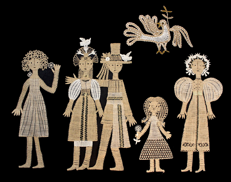 pair: 15" x 8", sleeve woman: 13.75" x 5.75", woman: 13.5" x 6", girl: 8.5" x 4", bird: 5" x 7.5" Excellent condition. Linen, cotton, gold thread. Maybe Elena Holéczyová? Amazing group. Likely mid 20th c. Bought from a German seller.