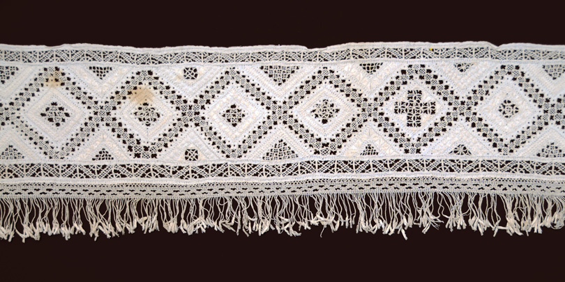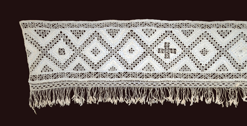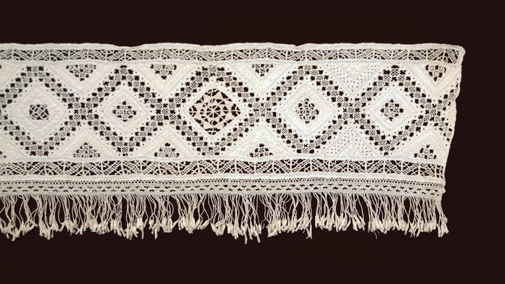 Lefkara Lace 136" need width This is Lefkara lace from Cyprus, probably made in the mid 20th c. Tripartite design with a bottom knotted fringe. The middle strip has different fillings in each diamond motif, and the bordering triangle fillings are the same at the top and bottom, but change along the length. The fringe might be bobbin lace, and is attached separately.
