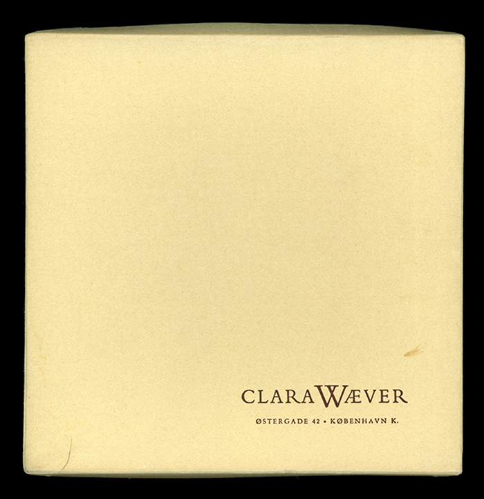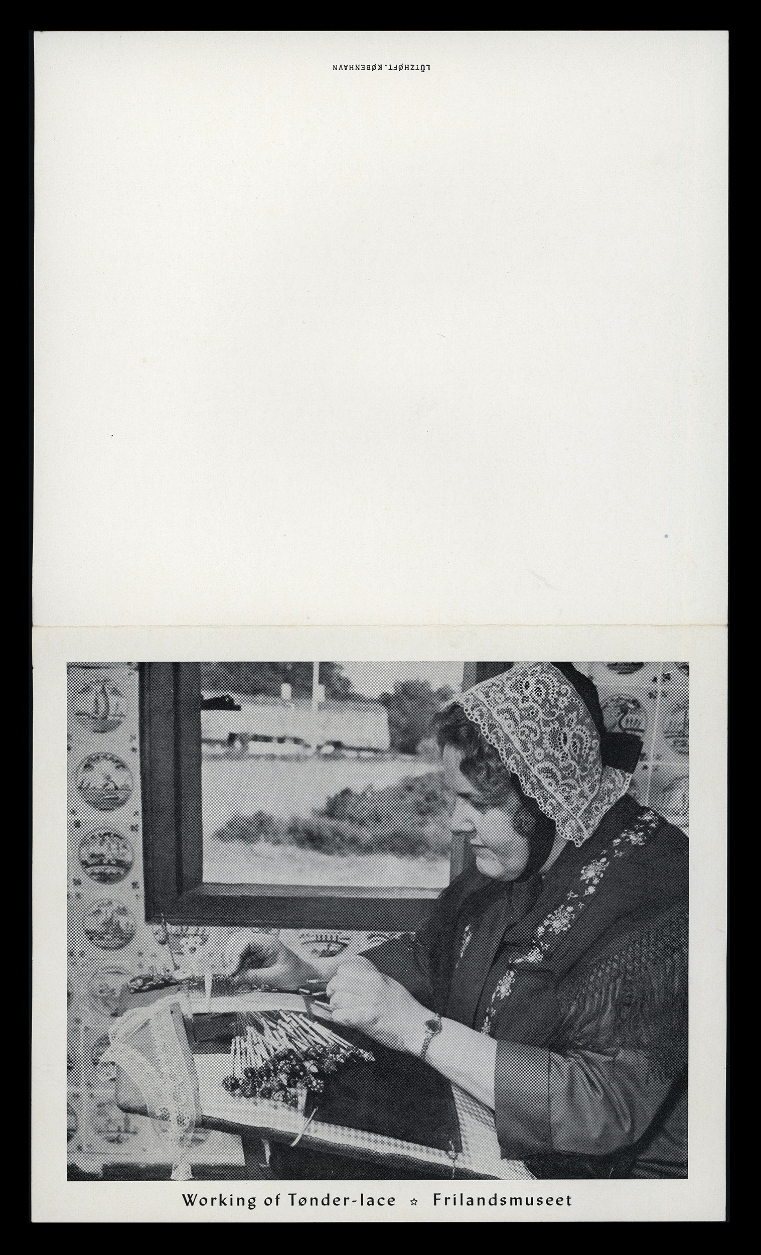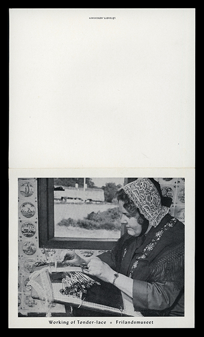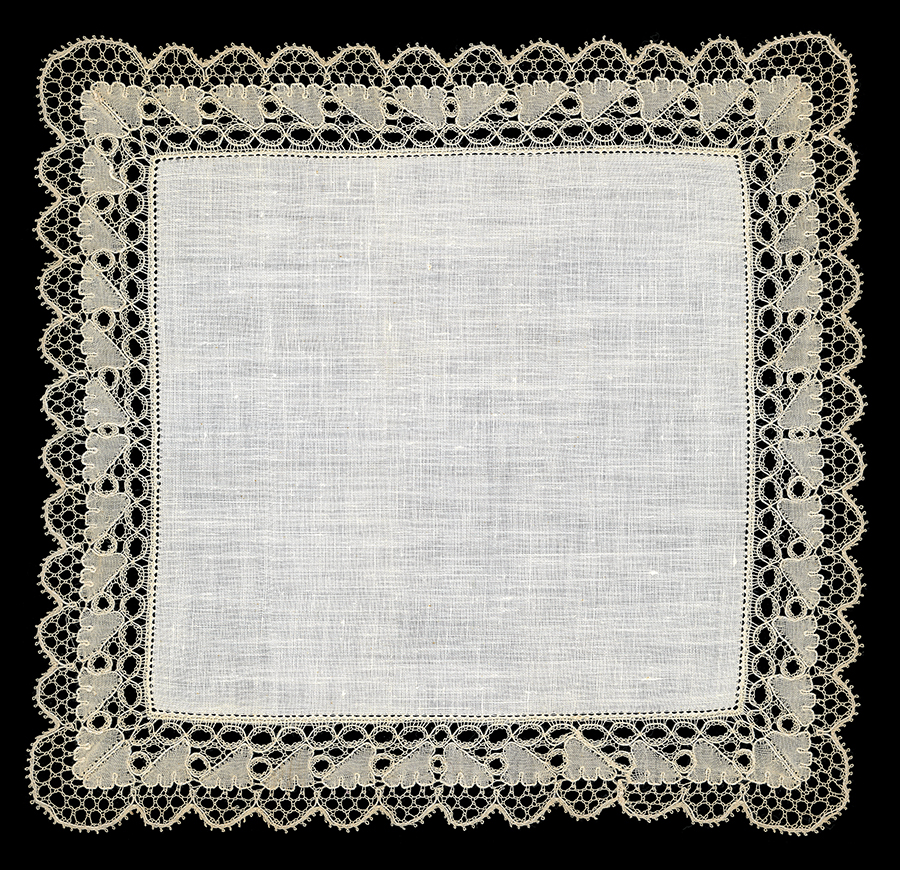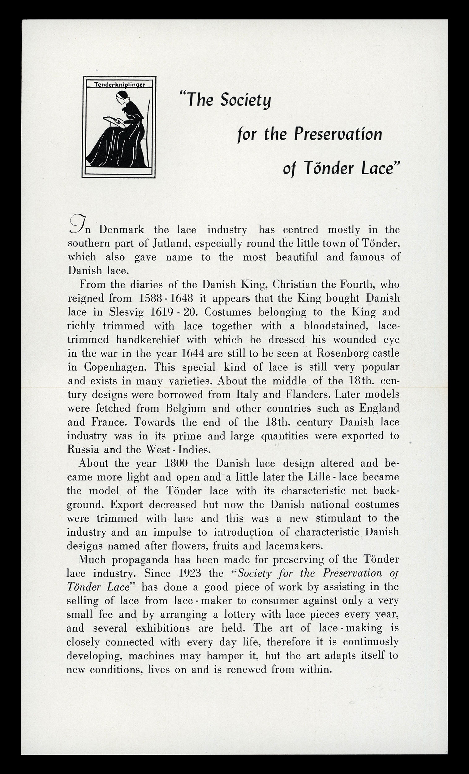 Handkerchief, 8" square, box 6" square, folder 5.5" wide, tag 3/4" wide. A Tønder handkerchief with provenance. Came with a box labeled Clara Waever from Copenhagen, along with a tag attached to the lace (removed) and a fold-out brochure describing "The Society for the Preservation of Tönder Lace". That organization was founded in 1923, unclear if it survives today. There is a Wikipedia article about Clara Waever which says her shop, specializing in cross stitch embroidery was sold in 1917 and became known as Eva Rosenstand Clara Waever. It continues today in Copenhagen as Eva Rosenstand. So dating this piece is a bit difficult - probably mid 20th c. The design is fairly simple, derived from contemporary Lille pieces in the 19th century. The attached tag says "Lille Skovblad?", indicatnig this is a Lille derivation.