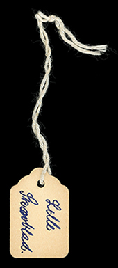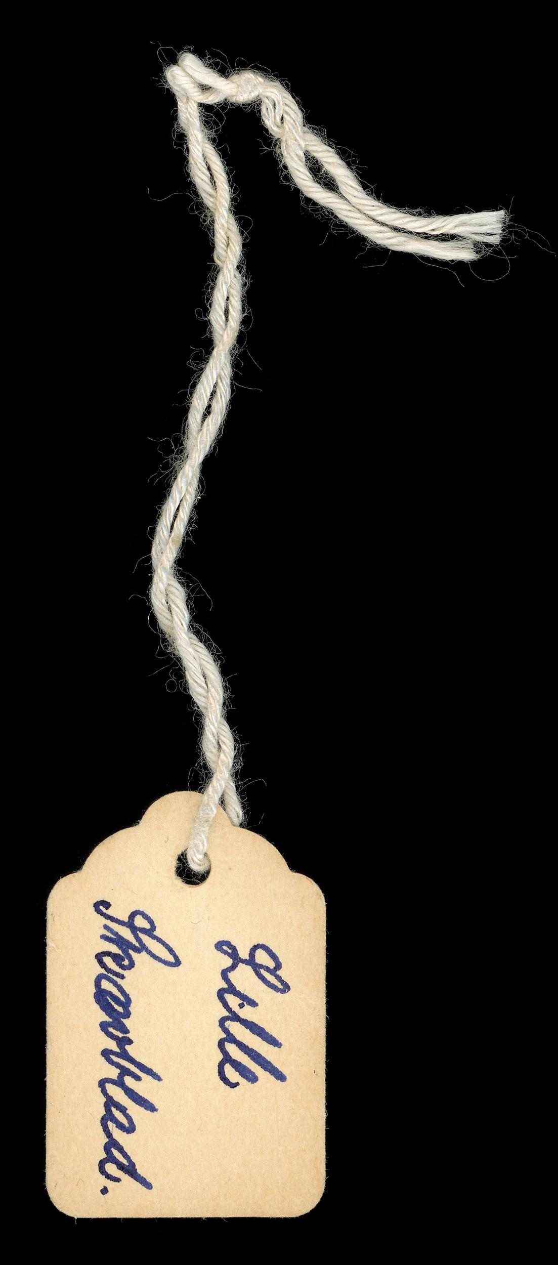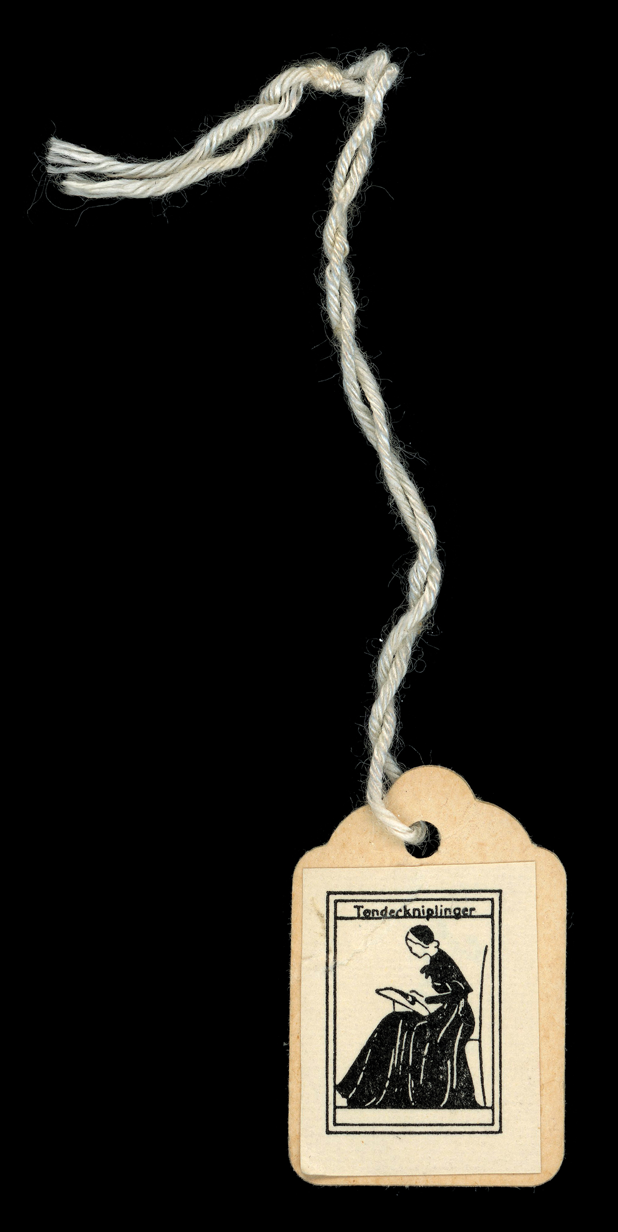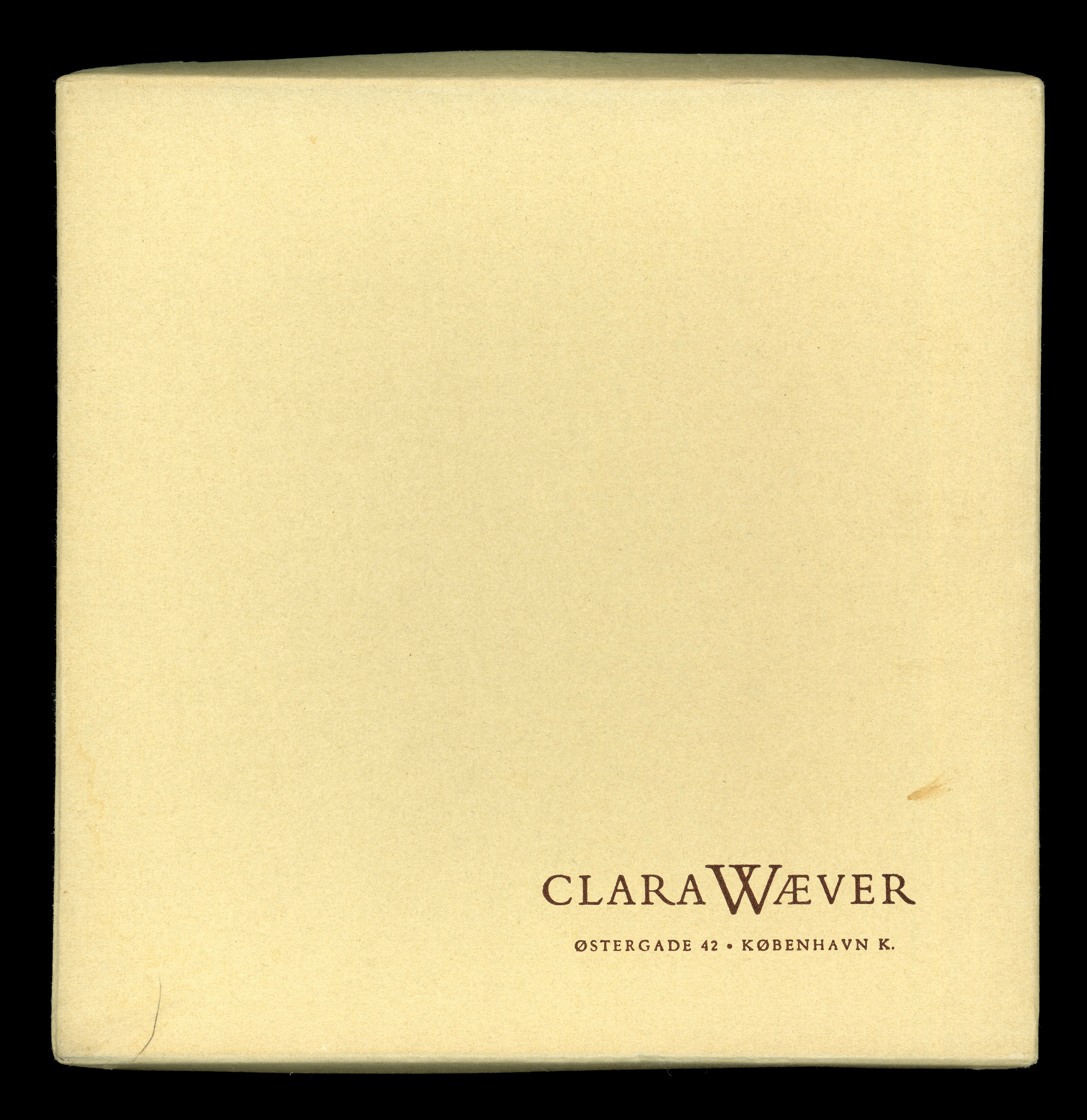 Handkerchief, 8" square, box 6" square, folder 5.5" wide, tag 3/4" wide. A Tønder handkerchief with provenance. Came with a box labeled Clara Waever from Copenhagen, along with a tag attached to the lace (removed) and a fold-out brochure describing "The Society for the Preservation of Tönder Lace". That organization was founded in 1923, unclear if it survives today. There is a Wikipedia article about Clara Waever which says her shop, specializing in cross stitch embroidery was sold in 1917 and became known as Eva Rosenstand Clara Waever. It continues today in Copenhagen as Eva Rosenstand. So dating this piece is a bit difficult - probably mid 20th c. The design is fairly simple, derived from contemporary Lille pieces in the 19th century. The attached tag says "Lille Skovblad?", indicatnig this is a Lille derivation.